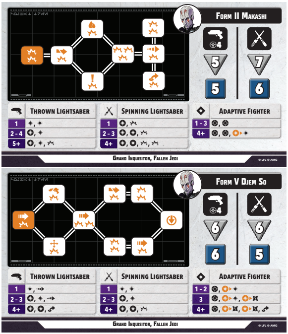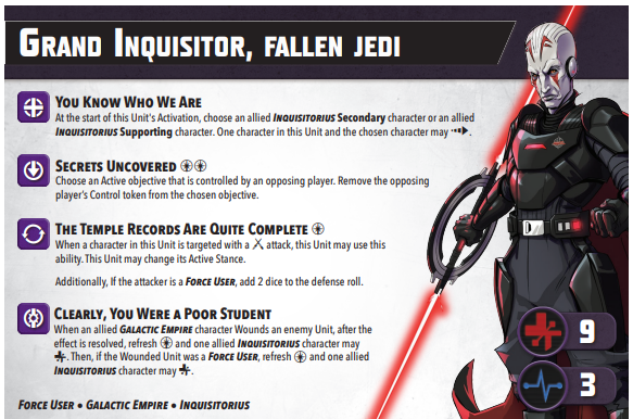 Another character who looks threatening on paper but falls short in execution on the table is Grand Inquisitor. His abilities were too costly, or too restrictive, or far too difficult to set up and pull off, which severely limited his effectiveness for changing strategies quickly. “Secrets Uncovered” removed the range restriction from Range 5 and changed it to anywhere on the board. “The Temple Records are Quite Complete” got a total overhaul, simplifying the ability, and rewarding him with going up against Force Users. Lastly, his stances got some small adjustments to make them be more efficient, with a few stat boosts, which makes his “The Temple Records are Quite Complete” that much more effective.