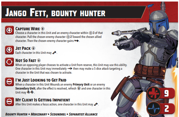 Not all characters got a glow up. In fact, Jango Fett lost some of his luster. Not only was he was an incredibly popular tournament choice, seeing a lot of time on the table, but he just brought so much to the table that it was hard to rationalize not including him in any strike team. “Not So Fast” was downgraded which made him less of a walking Thermal Detonator and more of a tactical threat for played reserved units. Also, “I’m Just Looking to Get Paid” was reduced down to one Force refresh instead of two.