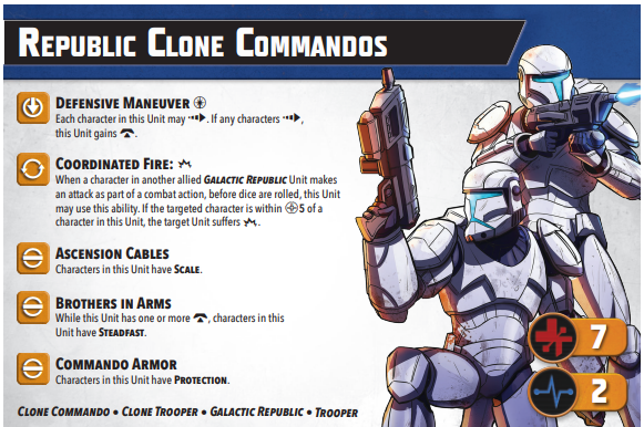 Without going too much in depth for each of the Clone Units, the overall changes were meant to help give the clones a little more durability and combat effectiveness. Compared to other supporting units in the game, the Clones weren’t really supporting well and many just didn't have the staying power. With the exception of the ARF Troopers, who exchanged Coordinated Fire for Supporting Fire, all of the other clone units received improvements. One example is this is the Republic Commandos got a bump for their defensive expertise and an extra health point. Another example is the 212th Clone Troopers gained the Clone Marksmen ability, which gives them Sharpshooter 1 (it adds 1 additional dice to its next Ranged attack in addition to the 1 attack die added by the focus action).