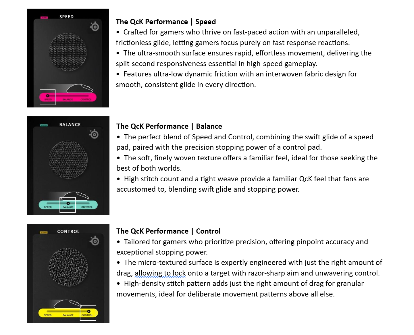 CHICAGO – March 11, 2025 – SteelSeries, the original esports brand that fuses gaming and culture, today unveiled the latest evolution of its critically acclaimed QcK mousepad line, the QcK Performance Series. The new series is the first set of mousepads to specifically cater to diverse gamer playstyles with three distinct mousepad surfaces: Speed, Control, and Balance, available in Large and Extra-Large sizes.