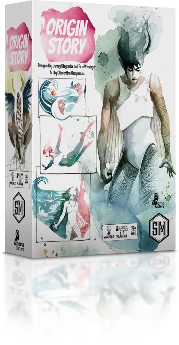 Origin Story is a 1-5 player competitive tableau-building, trick-taking game played over 5 rounds designed by Jamey Stegmaier and Pete Wissinger. Each round represents a chapter in your development and grants a new card to add to your player mat. Charge your cards and use their abilities to score more points than your opponents, then burst into action in your final superhero form in the final round.