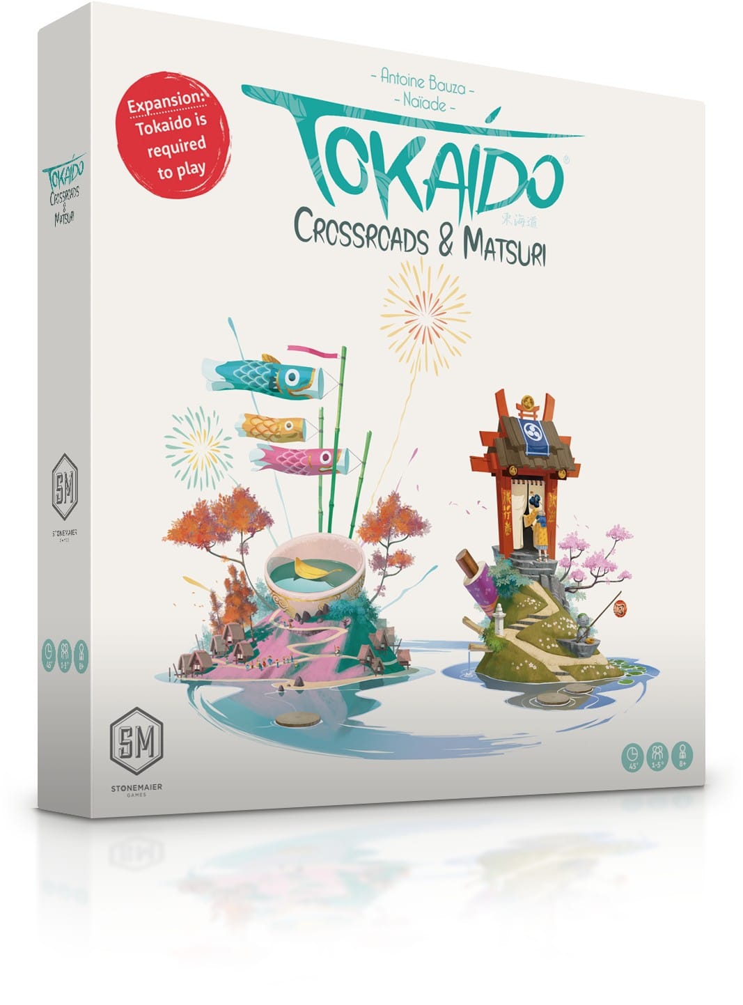 Tokaido Expansion and Playmat: Designed by Antoine Bauza and illustrated by Naïade, Tokaido: Crossroads & Matsuri combines the original two expansions and expansion travelers (including most promos) into one box, adding a level of complexity to the core game. Crossroads (referring to alternative choices along the path) adds cherry trees in full bloom, luxurious bathhouses, good luck charms, calligraphy, legendary objects, and even clandestine gambling rooms to the Tokaido journey! Matsuri (the Japanese word for festivals), triggered by the arrival of the Travelers at intermediate Inns, enliven the path with unique events. As an optional add-on, we're offering a natural rubber playmat that replaces both the game and expansion boards.