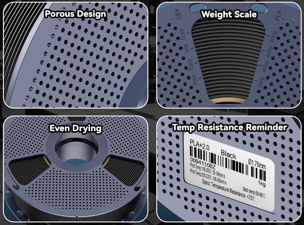 Beyond sustainability, the SUNLU Reusable Spool is engineered for high-temperature resistance for the filaments PA6, PA12 CF, PC, ABS and Easy PA, making it suitable for filament drying and storage. Its porous design enhances airflow for better drying performance, while clear usage instructions and built-in labeling areas help users organize and track their materials with ease. Additionally, the detachable structure, integrated cable tie system, and built-in weight scale make filament swaps effortless and allow for precise tracking of material usage. Designed for versatility, the spool is compatible with a wide range of filaments and seamlessly integrates with SUNLU’s filament dryer, making it a practical choice for all 3D printing setups.