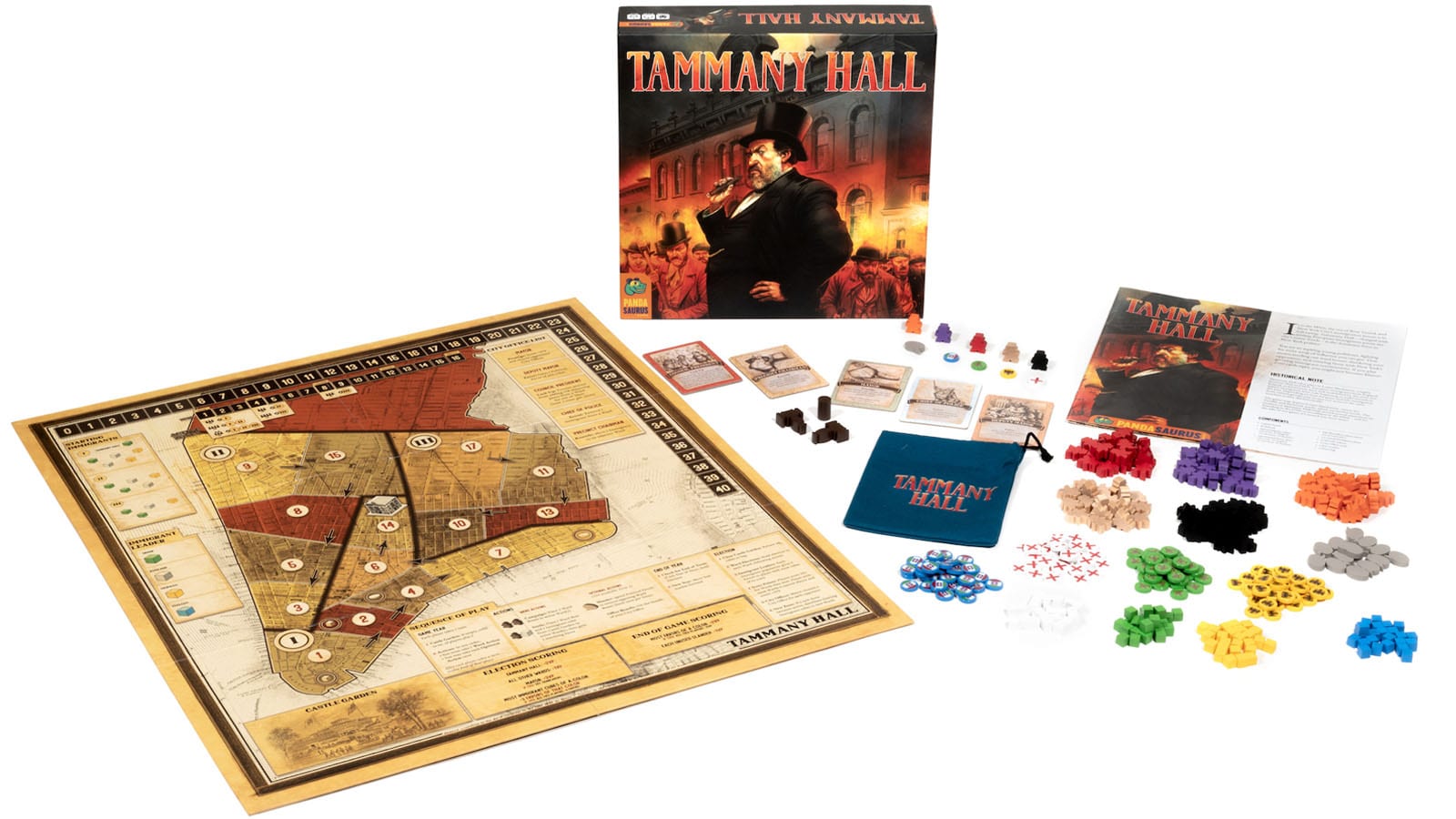 Pandasaurus Games is excited to announce that their critically lauded and gamer-adored first game Tammany Hall is now available for purchase again on their website. This is a game of backstabbing corruption, temporary alliances, and fighting for power at all costs and this new edition contains new and updated artwork as well as new components. This game for 3-5 players is ranked in the top 400 strategy games on BGG and is available for $49.95.