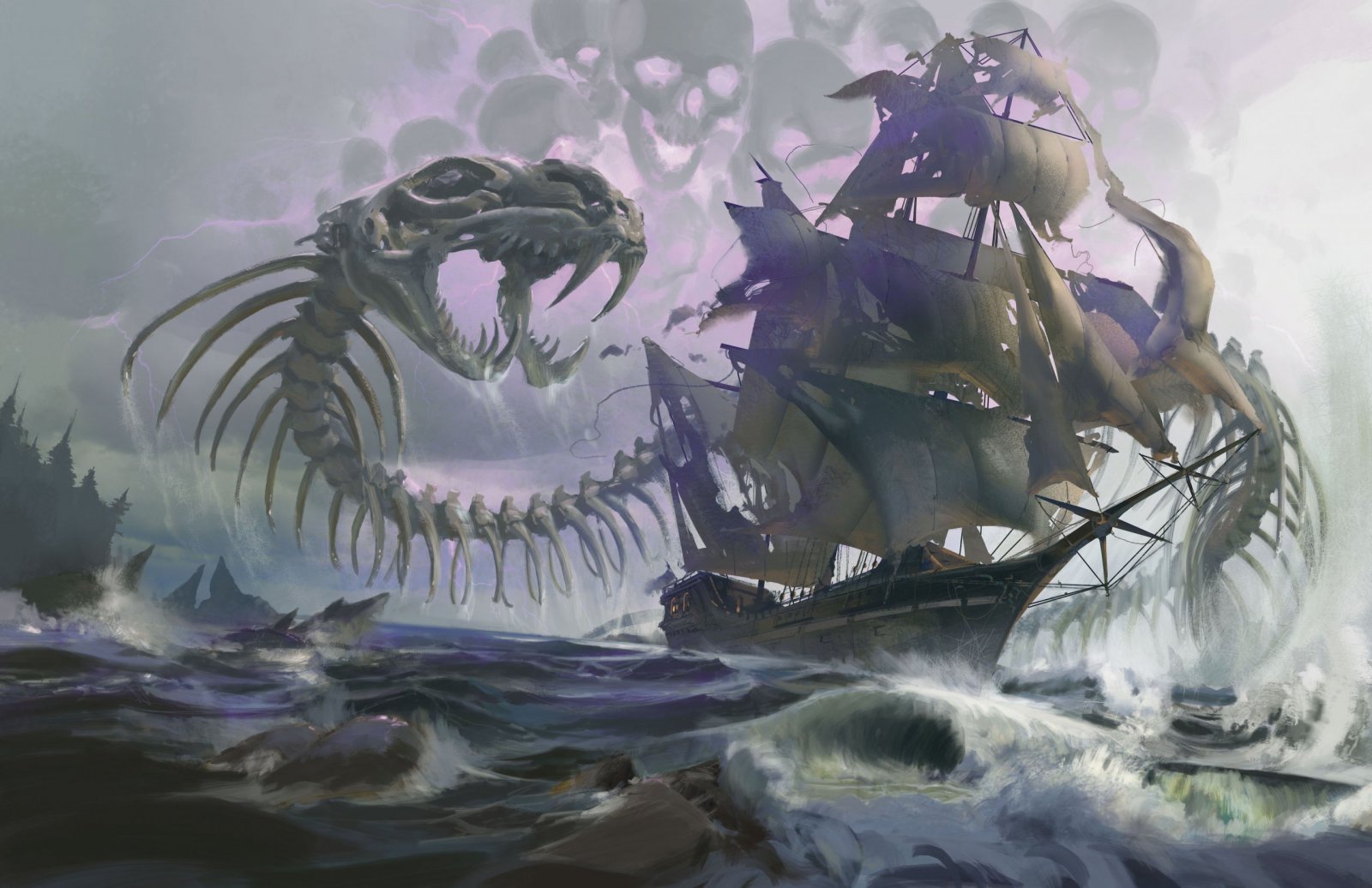A heavy, ominous storm brews at sea as clouds gather. But these are not normal storm clouds. These have formed into a churning mass of enormous skulls in the sky.