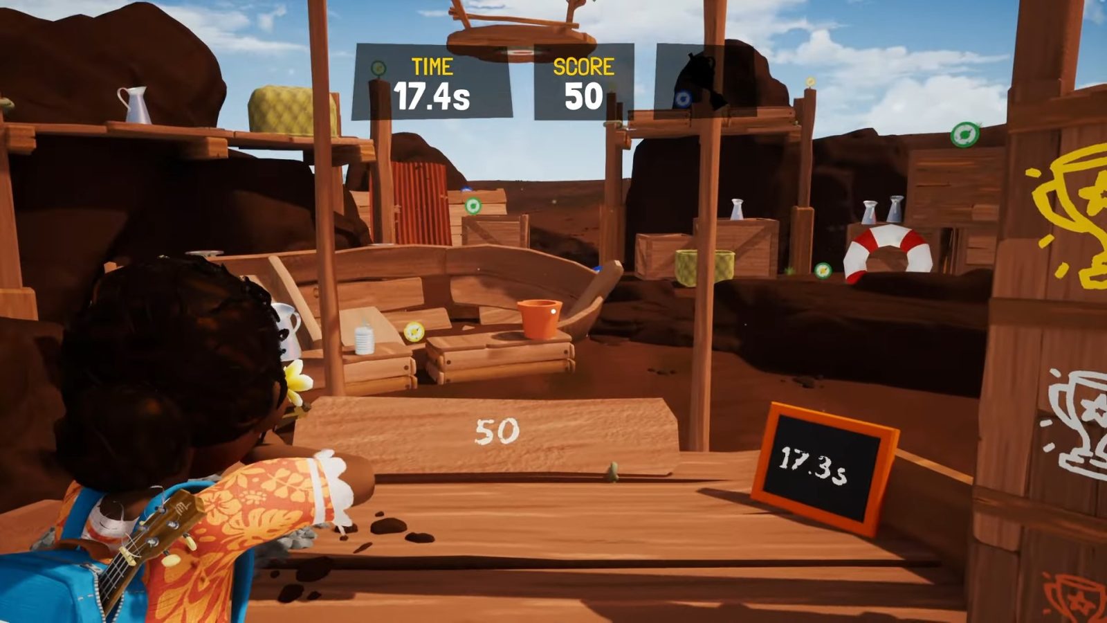 While you’re trying to save your home, you can kick back and take a break with some more relaxed activities. Show off your slingshot skills at the shooting range, race on foot, by boat or by seagull in time attack races or flip out in a diving competition.