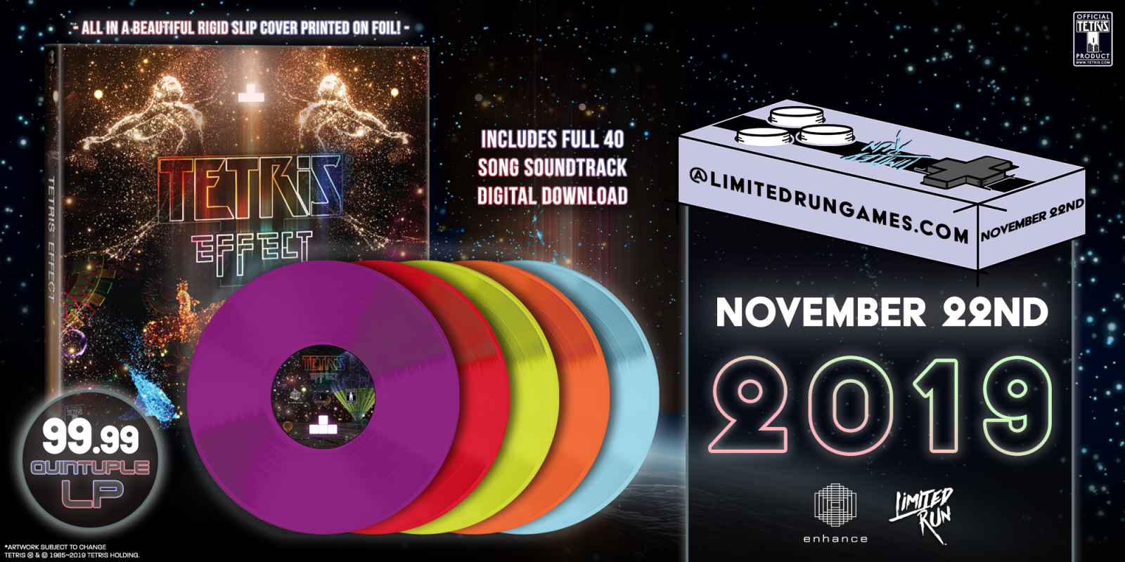 To celebrate the 1st anniversary of the November 2018 debut of Tetris® Effect on PS4 and PSVR, Enhance announced today a partnership with Limited Run Games to produce a vinyl release of the game’s long-awaited soundtrack, as well as reissue a physical version of the PS4 game, which has largely sold out of new copies at retail.