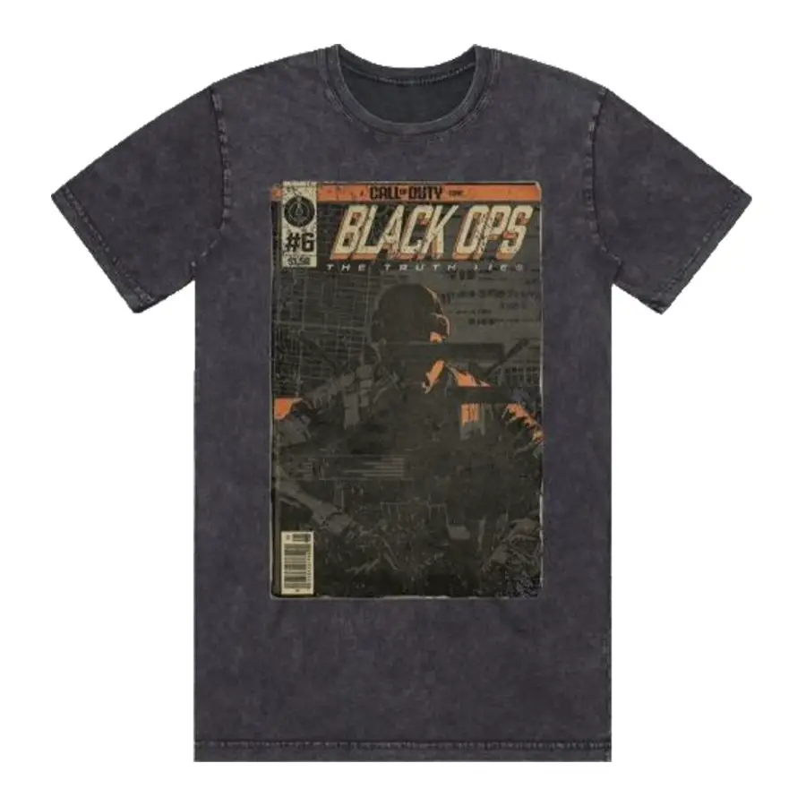 - A lightweight cotton t-shirt with a vintage 90s-style poster design celebrating the Black Ops 6 release. Comfortable and stylish for fans of the franchise.