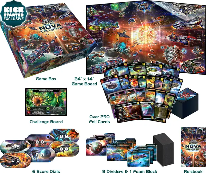The Nova Collection features beautiful foil versions of every card from Promo Pack 1, the Gambit Set, Crisis: Bases and Battleships, Crisis: Events, Crisis: Heroes, Crisis: Fleets and Fortresses, the Cosmic Gambit Set and the Star Realms Base set with 6 starting decks and extra Explorers.