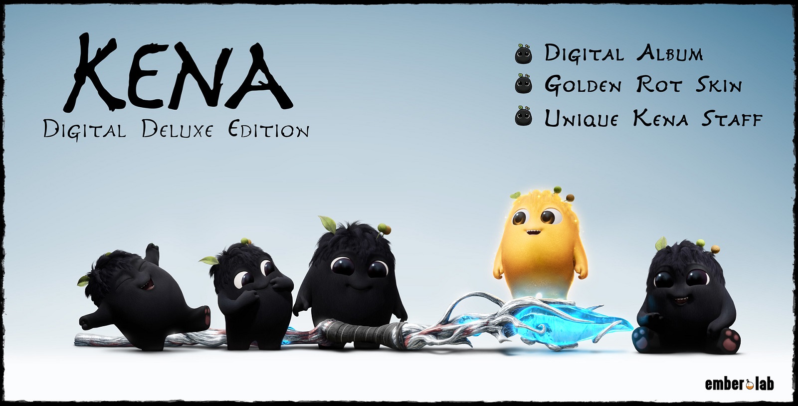 We’re also excited to announce the editions that will be available including the Standard Edition ($39.99 USD / €39.99) and the Digital Deluxe Edition ($49.99 USD / €49.99). All editions of Kena: Bridge of Spirits entitle you to both the Digital PS4 and Digital PS5 versions of the game. The Digital Deluxe Edition includes the Digital Soundtrack, a unique silver staff for Kena and golden Rot skin.