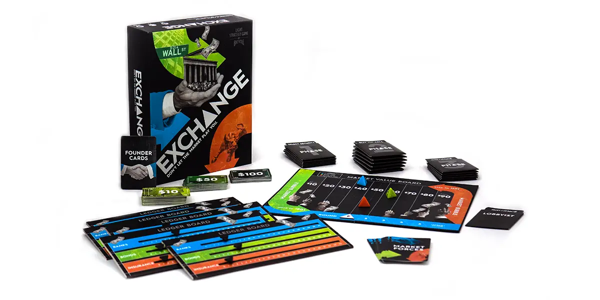 In Exchange, you are a securities trader competing for the highest net worth on Wall Street. Players will carefully plan their strategies over five rounds, trying to cash in big in a constantly changing market. The only thing harder than trying to predict the market is anticipating the actions of your opponents, sitting at the table with you. In the end, the player who corners the market and has the highest net-worth will win the game and the title of the best trader on the Exchange.