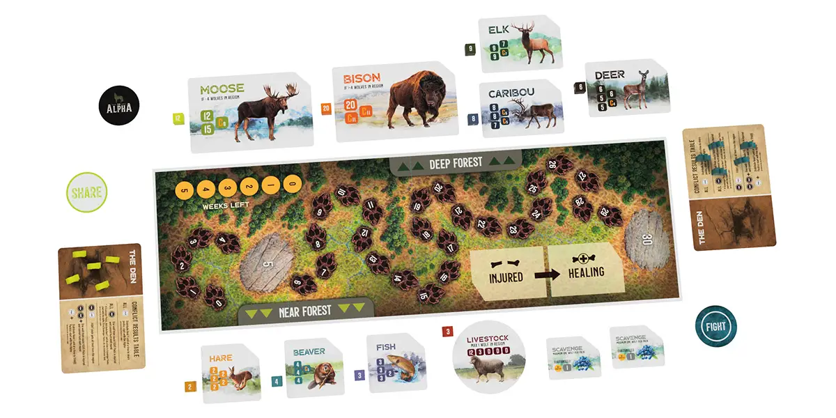 In The Alpha, players control a wolf pack, and they lead the wolves on a search for food. The Near Forest includes easier to catch, but lower value prey. The Far Forest has larger prey that are more difficult to attack, but if successful can result in a great reward. You will lead your wolves through four stages of the hunt which include the STALK where you send your wolves to hunt in various regions of the forest and outnumber rival packs to become dominant in the area. The CHASE where you roll the dice for the region to determine the success of the hunt. RESOLVE has you enter a conflict and decide whether to fight or share food with other packs in the region. Finally, ADVANCE where you can move your wolf on the food track to indicate the amount of food secured during the hunt. At the end of five rounds, the wolf pack with the most food will be declared The Alpha.