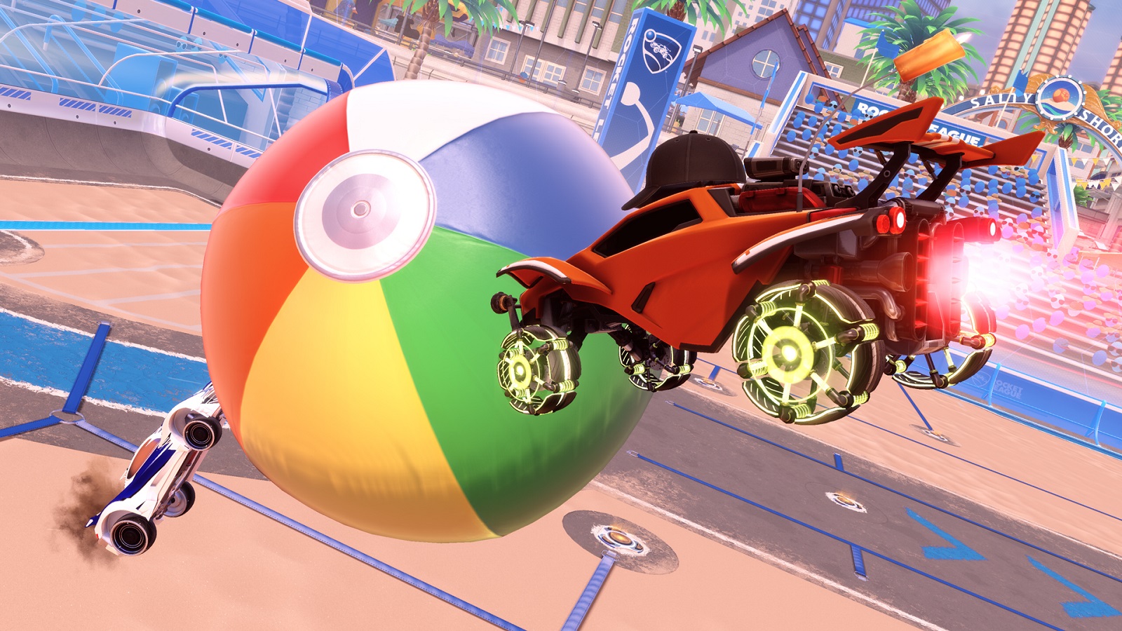 Hop into your Battle-Car, put on your aviators, and hit the sandy beaches of Salty Shores for the new limited-time Beach Ball Mode. This feel-good mode features 2-on-2 action with a large, reskinned ball that floats and curves just like a beach ball. We look forward to seeing your sweet beach montages in super slow-mo.