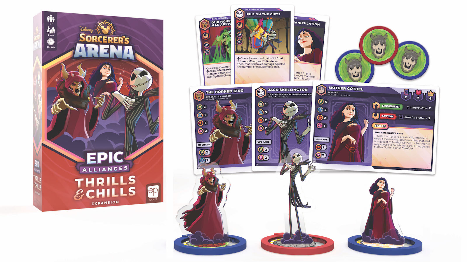 Disney’s Sorcerer’s Arena: Epic Alliances adds three new powerful characters to the mix in this expansion; Mother Gothel from Rapunzel, The Horned King from The Black Cauldron, and Jack Skellington from The Nightmare Before Christmas.