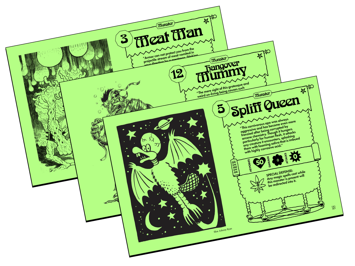 - Custom adversary and item cards that introduce everything from “Magic Edibles of Doubt” to “Cranky Talking Furniture”