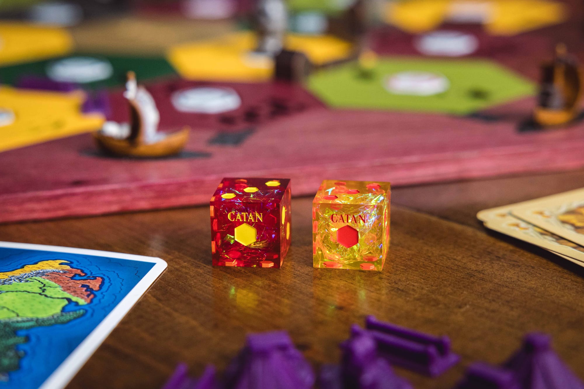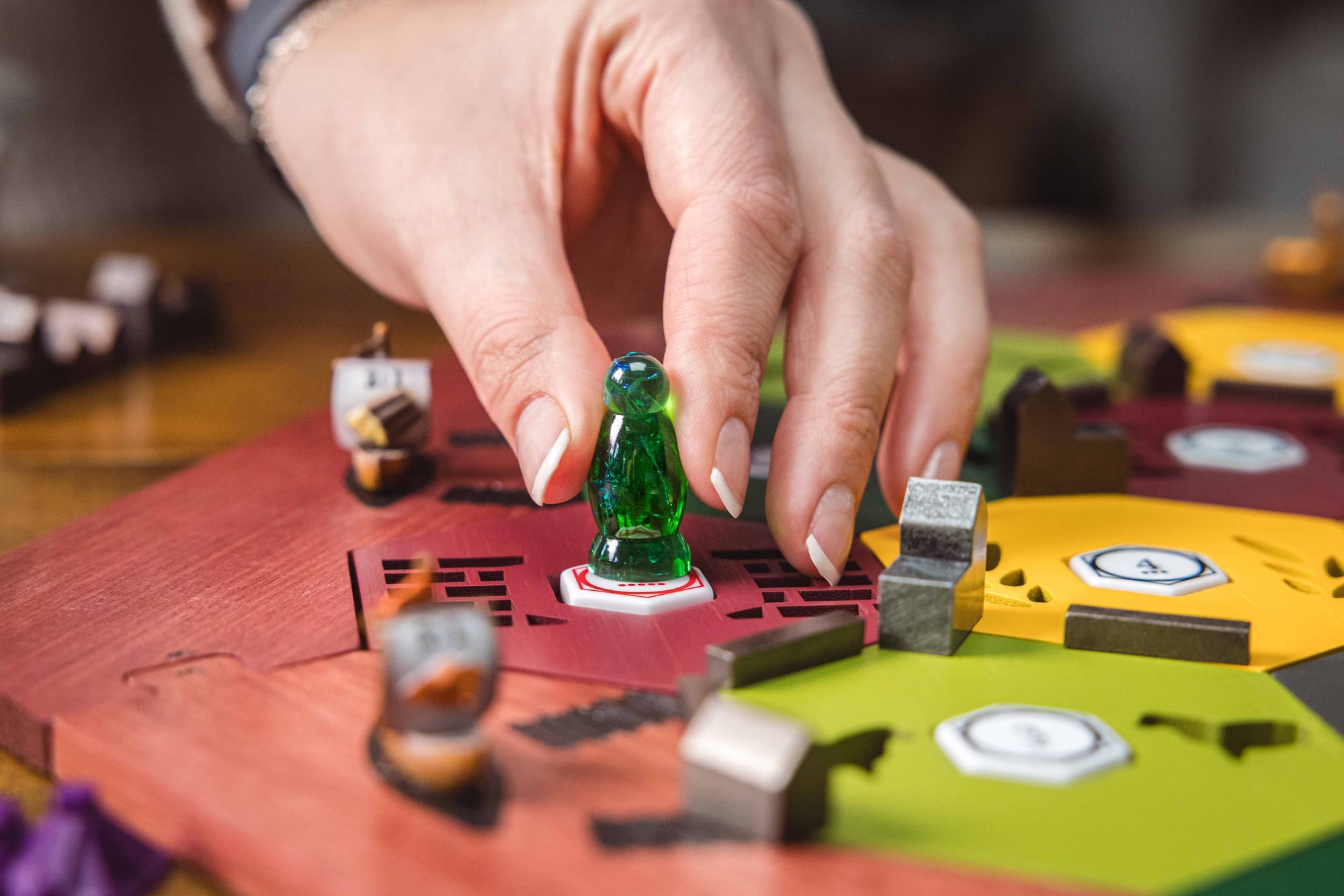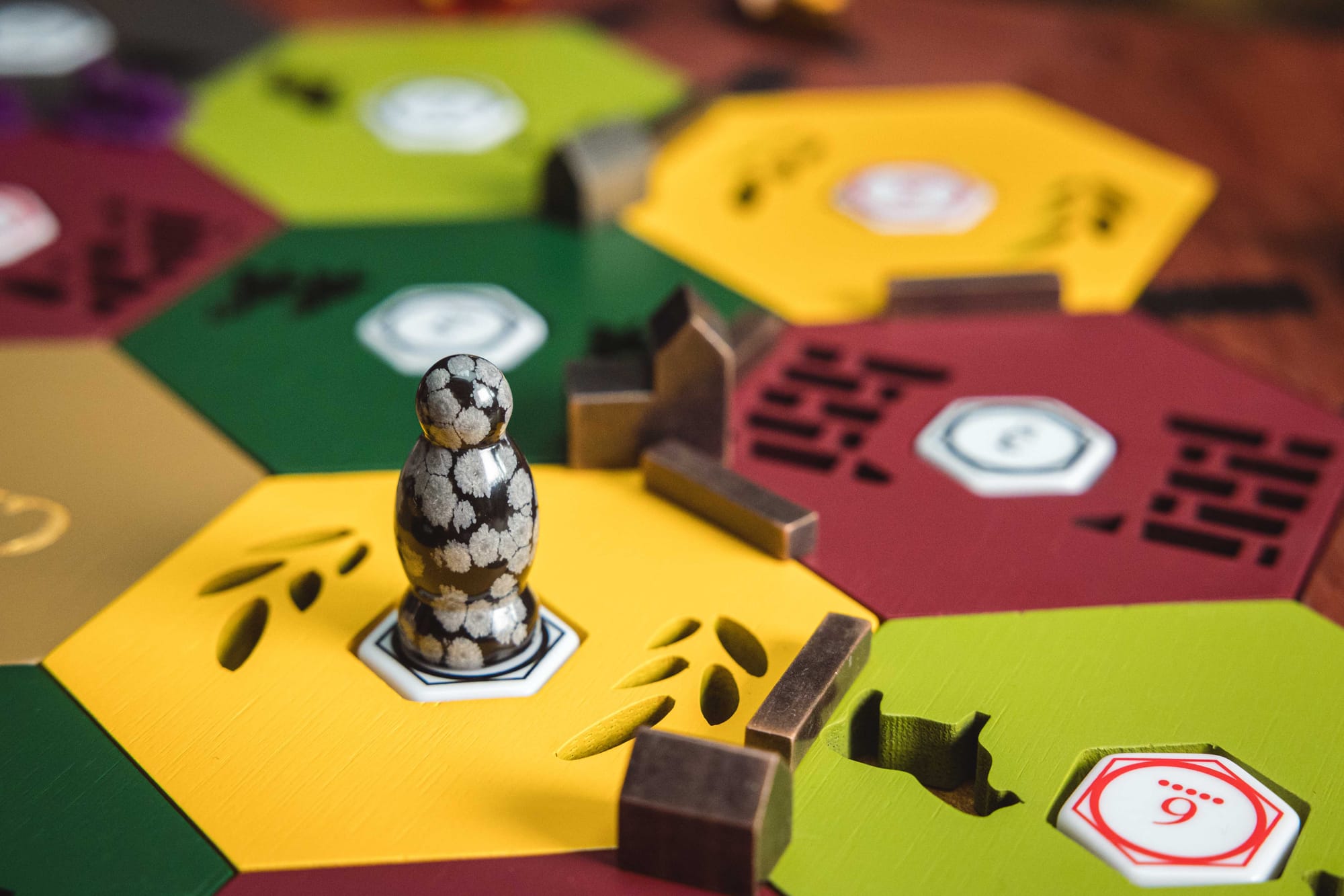These deluxe components offer backers over fifty different choices of player pieces, robbers, hexes, dice and more, featuring materials like wood, resin, and even gemstone: