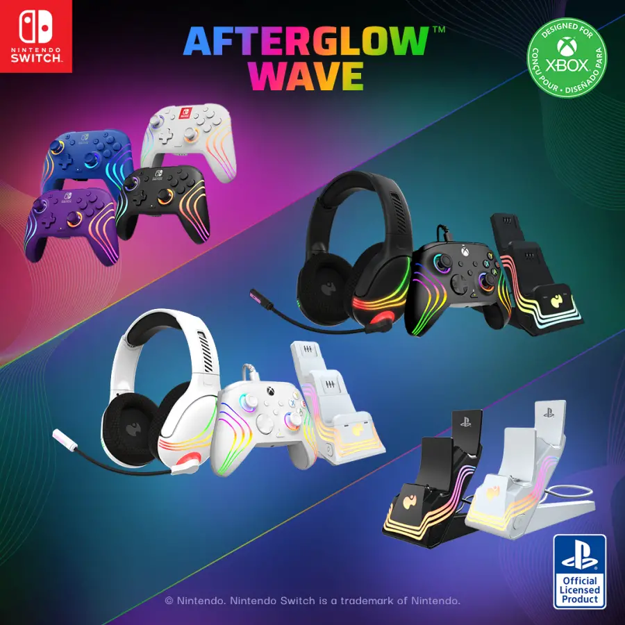 Introducing an all-new family of Afterglow Wave gaming accessories, including wireless and wired controllers, wireless headsets, and charging stations. The new Afterglow Wave controllers for Nintendo Switch come in a variety of revamped colorways, including black, blue, purple, and white for the wireless models. The new wired version comes in black, joining the previously released blue and gray wired options. All controllers have eight customizable RGB LED lighting zones and four pre-set lighting modes, and programmable back buttons. Plus, for the first time ever, the wireless versions feature new built-in motion sensors. The wireless controllers also feature a 30-foot range and 20-hour rechargeable battery. The Afterglow Wave wireless controllers for Nintendo Switch are available for pre-order for $54.99/£49.99/€59.99 MSRP, while the wired version costs $24.99/£24.99/€34.99 MSRP. The Afterglow Wave wireless controllers launch Sept. 22, 2024 (black/purple) and on Oct. 1, 2024 (blue/white). The new wired version in black launches on Oct. 28, 2024.