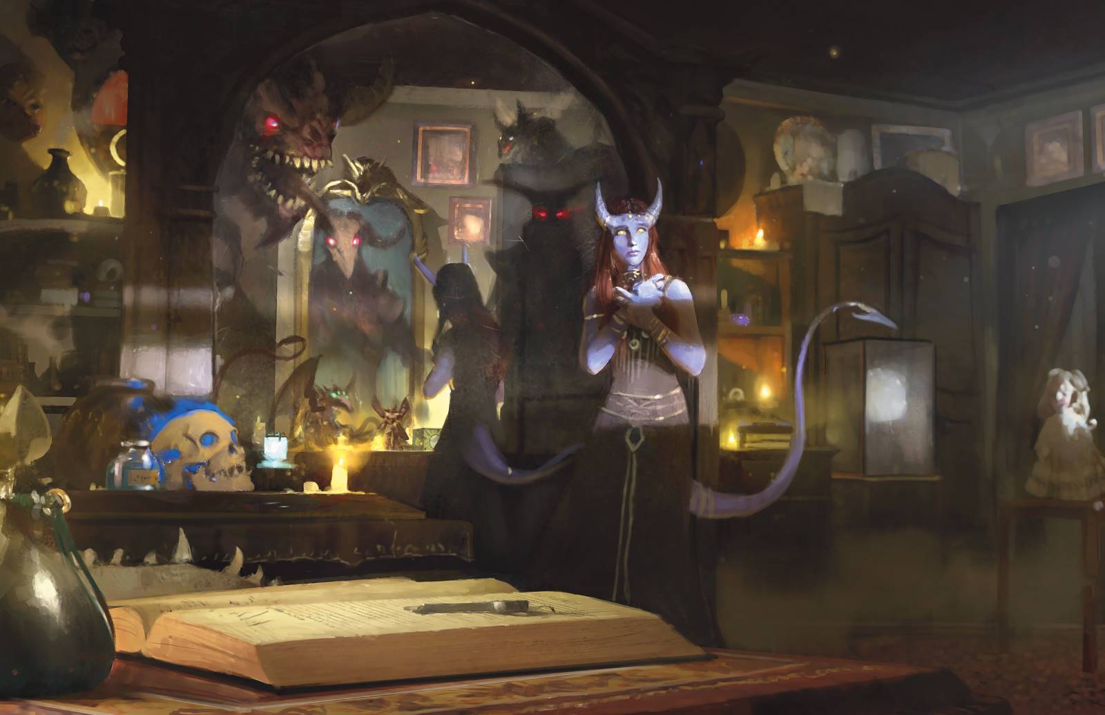 A terrified tiefling gives a glimpse into a horror-themed game, painted by Scott M. Fischer.