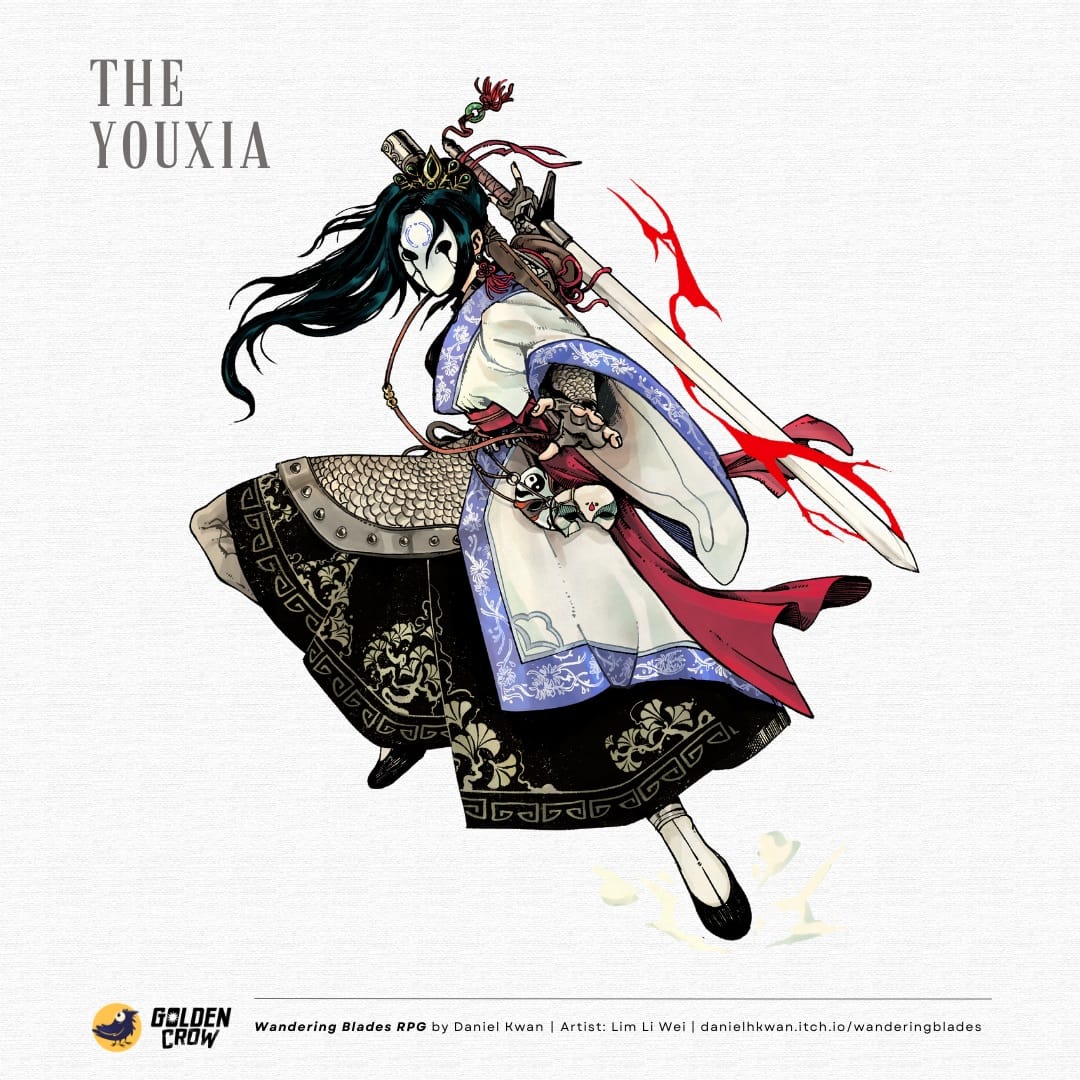 Wandering Blades is a roleplaying game of violent, martial arts melodrama for 2-5 players. In this game, players take on the roles of highly skilled martial artists who wander the lands seeking to redress wrongs, help the downtrodden, and free the innocent from oppressive forces. Using a streamlined system inspired by old-school renaissance products, Wandering Blades enables dynamic and lethal combat while empowering players to tell heroic and melodramatic stories inspired by Chinese wuxia media, Hong Kong action cinema, Japanese animation, and action video games.