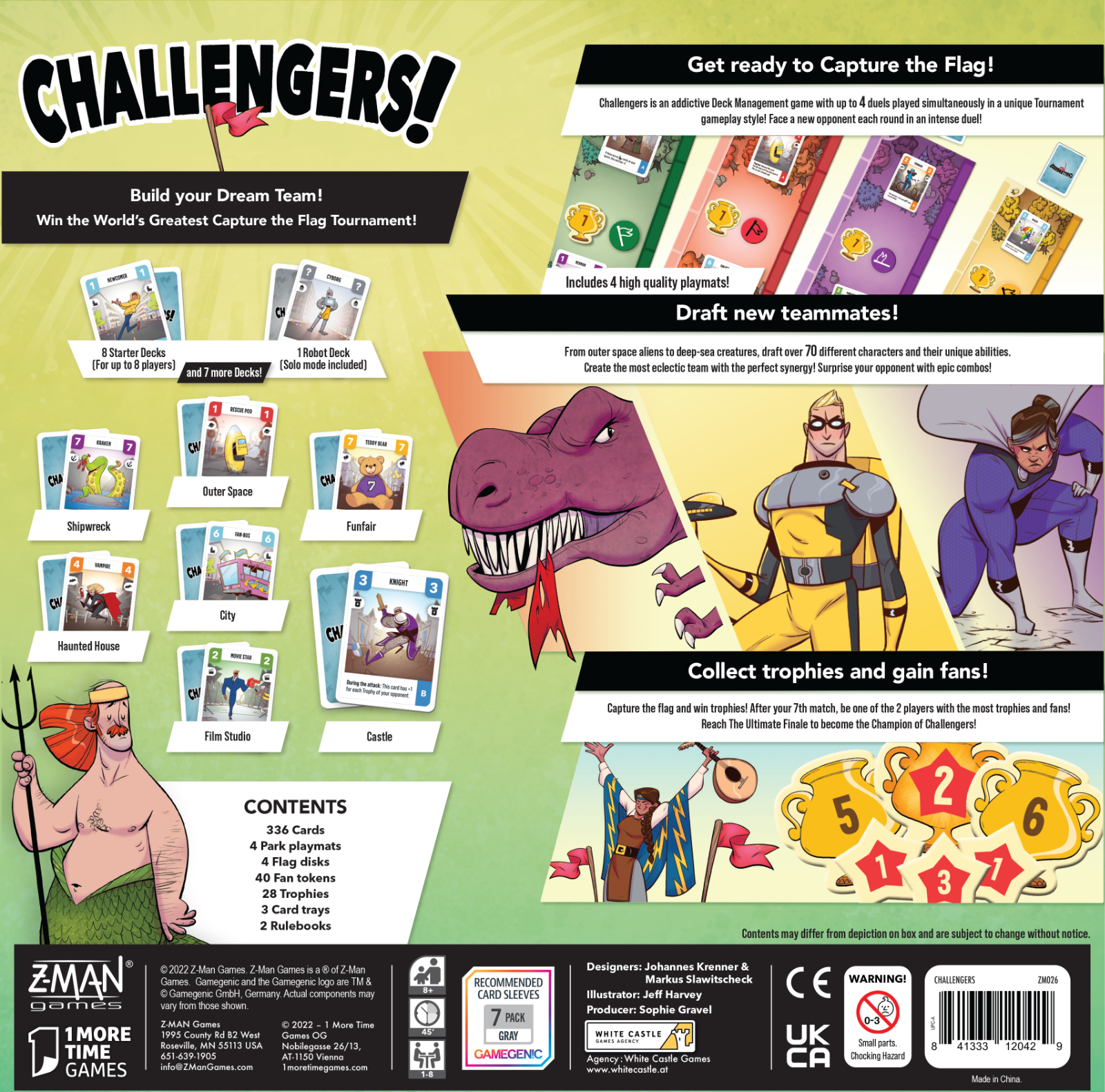 Challengers stars over 70 kooky characters from diverse locales like Hollywood, outer space, and the monstrous deep sea… or your bathtub. Players draft character cards with unique abilities and must make tough deck building choices between rounds, as each character combination opens up new ways to win. Across up to 4 simultaneous battles, players win trophies and fans by defeating other players in duels. After seven rounds, the two players with the most trophies and fans face off to become the ultimate champion. Players can also test a winning strategy in the game’s solo mode and should look forward to more team-building options with future character expansions.
