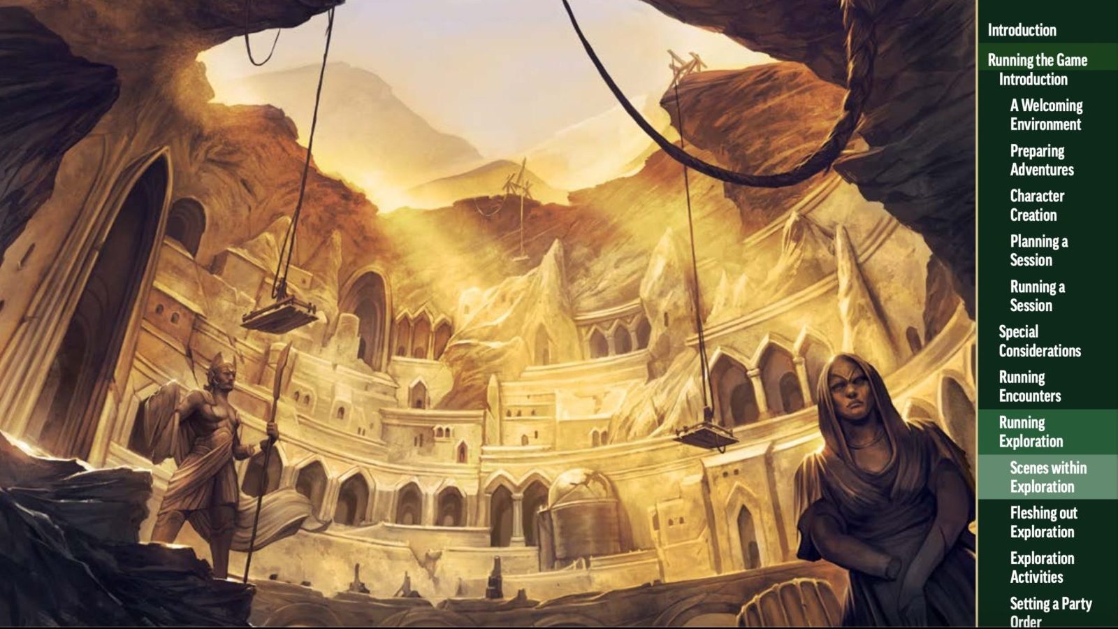 The first major section takes GMs through the basics of running a role-playing game, from the way players interact with the story, how to get campaigns up and running, to dealing with problematic situations that may arise in a game. They continue by explaining the ins and outs of how to run the three major phases of the game: encounters, exploration, and downtime.