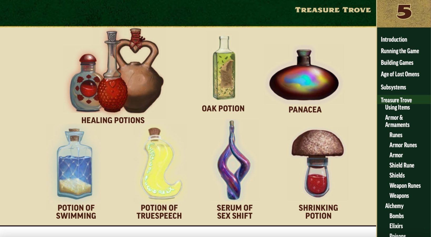 The last major section helps GMs populate the world with different types of items players may discover. From armor, weapons, and shields to potions, bombs, and poisons, to magical scrolls, talismans, and gems, the possibilities are endless for a GM. Each subsection describes possible items and how GMs can create or adapt their own items for use in the game. The section ends with a treasure table featuring leveled items, their price, and page number where the item is described. To round out the book, the glossary provides players with some basic information about different topics and includes pages in the GM Core, and the Player Core for some items, for easy reference.