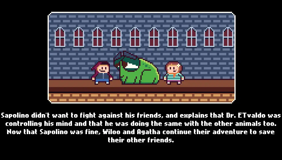 Super Wiloo Demake stars Wiloo and Agatha as their dog gets stolen by the evil Dr. ETvaldo, the latter of which thinks animals make people happy (which, in all honesty: True). You control one of the pair as they go across five worlds of “fun” and “challenge” to rescue their dog, all the while avoiding enemies and beating bosses that have been brainwashed into defeating our heroes.