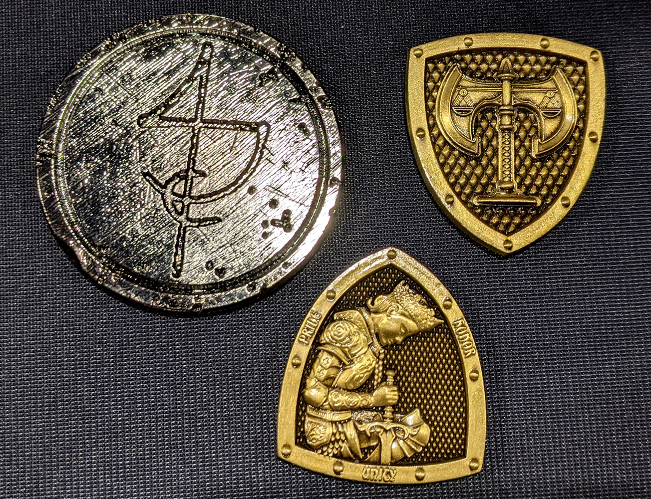 The realm coins are about one inch tall and crisply minted with great detail and texture. The Clasp Token is artificially weathered but still does a nice job of catching the light; all three have a solid weight.