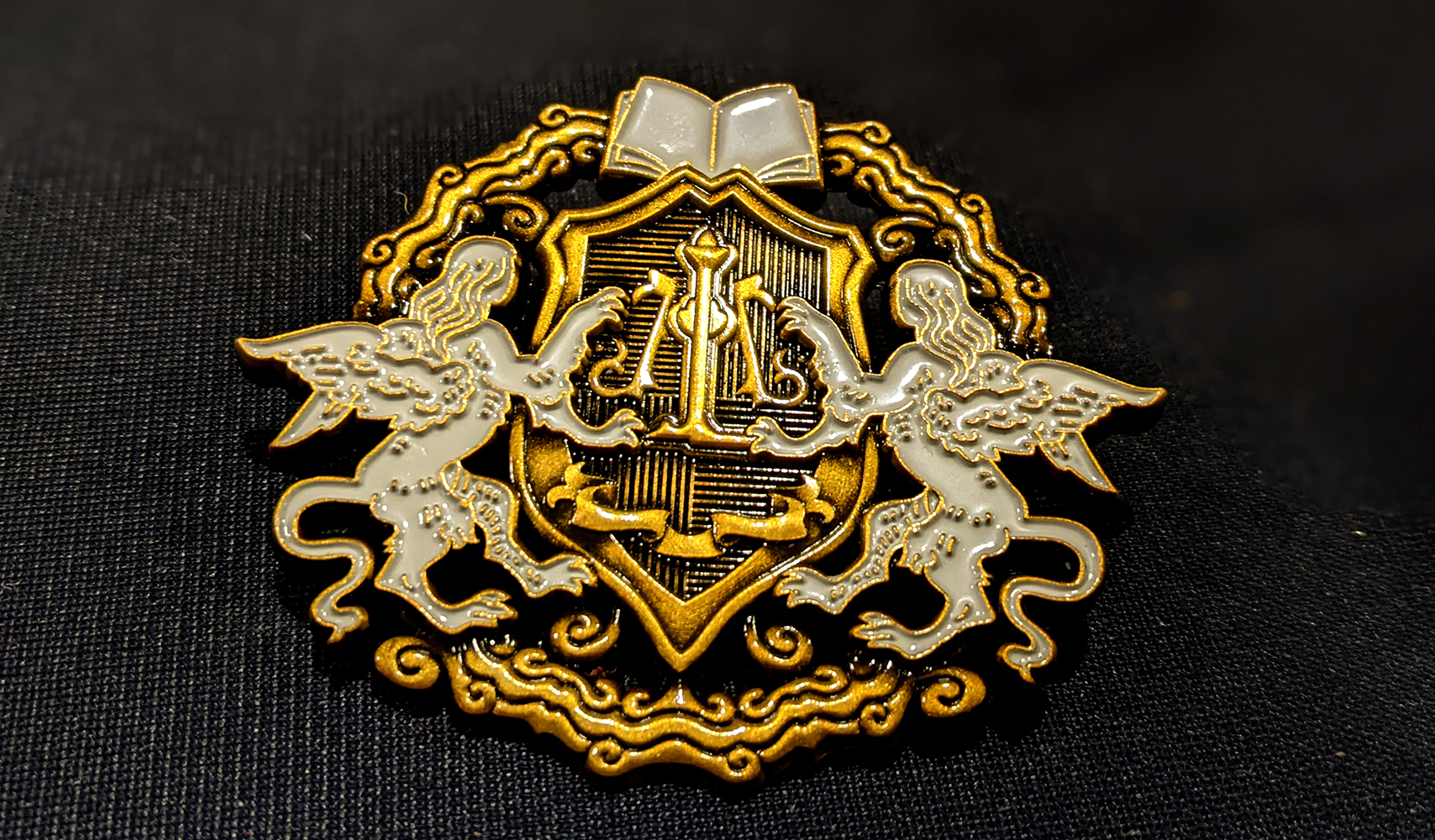 The Golden Grin pin falls on the other end of the spectrum, simple but expressive, as befitting a group which prefers to remain cloaked in mystery. Slightly rough but heavy, it’s got a good size and a surprising weight to it.