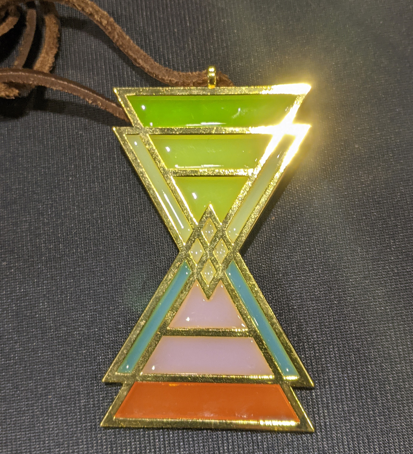Light and colorful, the gold of the pendant catches the light easily and often, and the colors are bright without being garish. The largest of the bunch, it’s thin with enamel lacquer and hangs off a simple leather cord.
