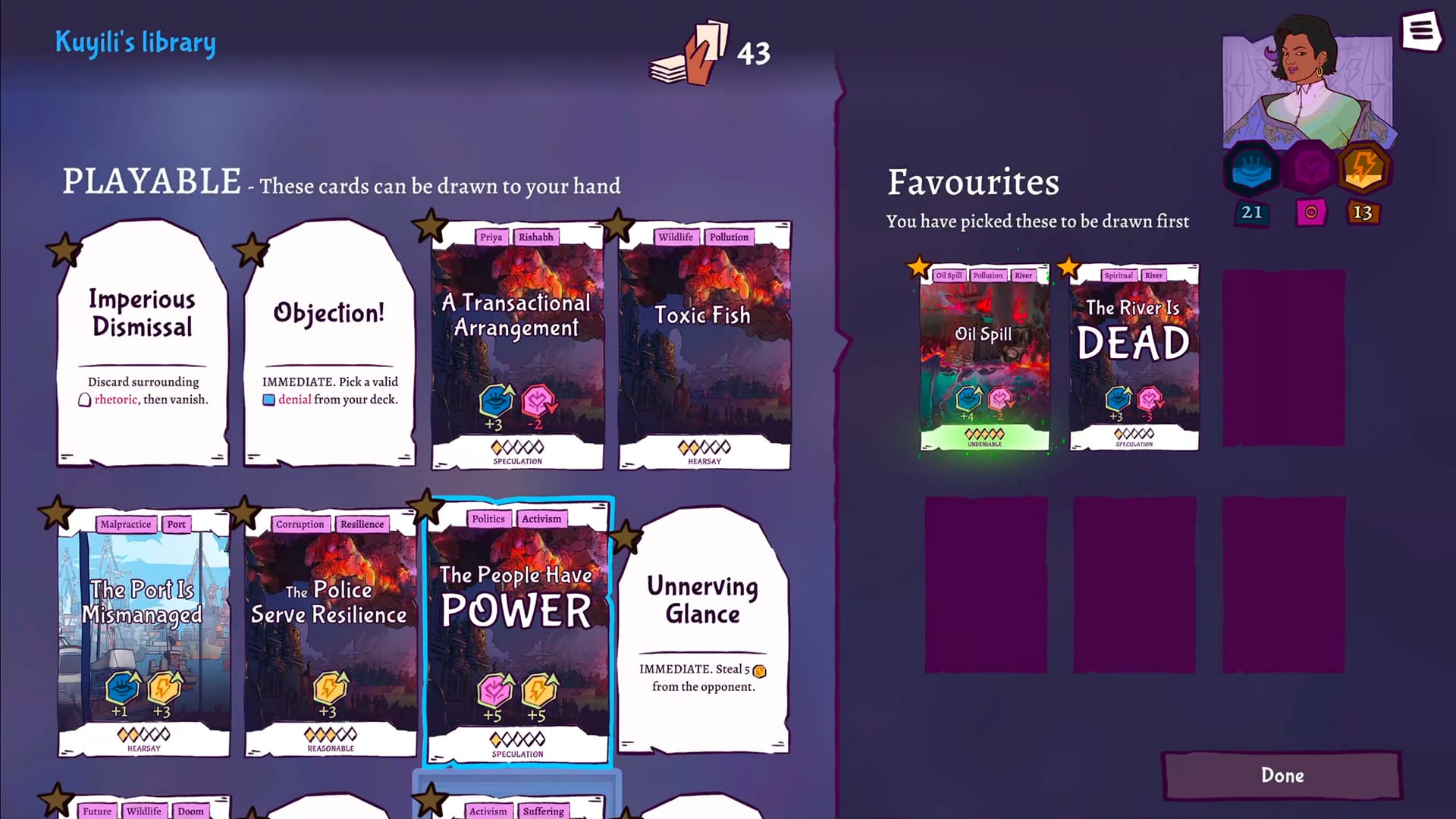 The exploration phase of the game sees you gathering information for the courtroom, building the deck you'll use in the second phase. For narrative encounters. the dynamics at play form a logical and mechanical throughline. The law is more than words on pages somewhere; making it effective means managing your team, the surrounding political players, and your own sanity. Burnout is a real, physical threat to this work. I've seen it take out more people in my time than anything else. In a given battle, you will take turns playing cards on the board. You'll choose a Claim, like The River Burns or The River is Dead, and follow the logic as it flows down, pyramidal, in a chain. At the top of the pyramid are grand concepts like human nature and capitalism, with distinct ideas flowing from there and being built by your evidence.