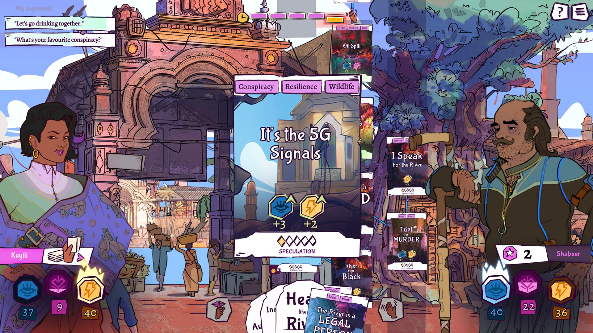 The exploration phase of the game sees you gathering information for the courtroom, building the deck you'll use in the second phase. For narrative encounters, the dynamics at play form a logical and mechanical throughline. The law is more than words on pages somewhere; making it effective means managing your team, the surrounding political players, and your own sanity. Burnout is a real, physical threat to this work. I've seen it take out more people in my time than anything else. In a given battle, you will take turns playing cards on the board. You'll choose a Claim, like The River Burns or The River is Dead, and follow the logic as it flows down, pyramidal, in a chain. At the top of the pyramid are grand concepts like human nature and capitalism, with distinct ideas flowing from there and being built by your evidence.