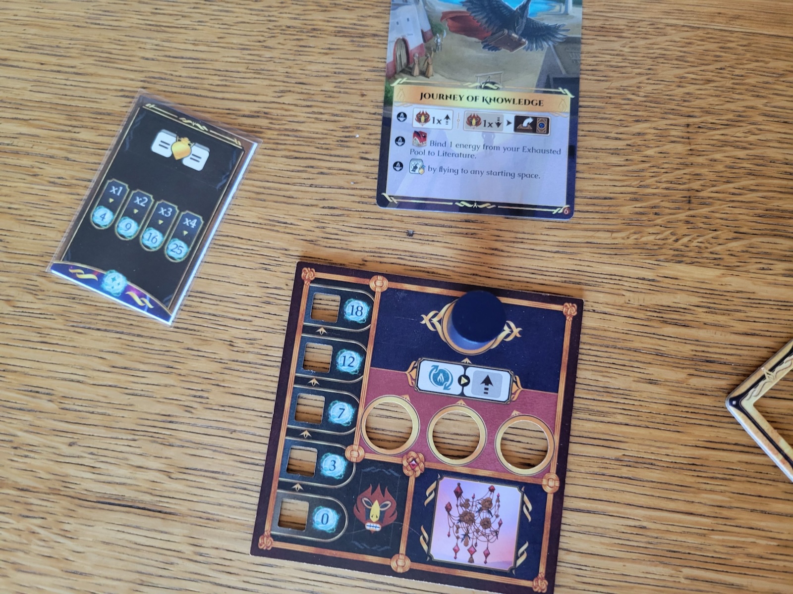The other universal module, Pilgrimage, has the players sending a believer on a hiking trip on the brand name Mt. Olympus. There’s a whole host of places to deploy your energy on this board, making the game that much less claustrophobic at higher player counts. You can give your little guy a giddyup with a channel charge and have him detour to a shrine for its benefit, but the real crunch here is navigating the race to the top for its hefty chunk o’ points without having to take the speed hit for running into the hurdles at each tier first while taking pit stops to take advantage of the huge shrine vistor benefits. Both modules also introduce doubler tokens and scoring cards, which do just what the names imply, attaching to any energy bound outside of an achievement so it counts twice and buffing one part of your end game score (eg. unlocked energy pairs).