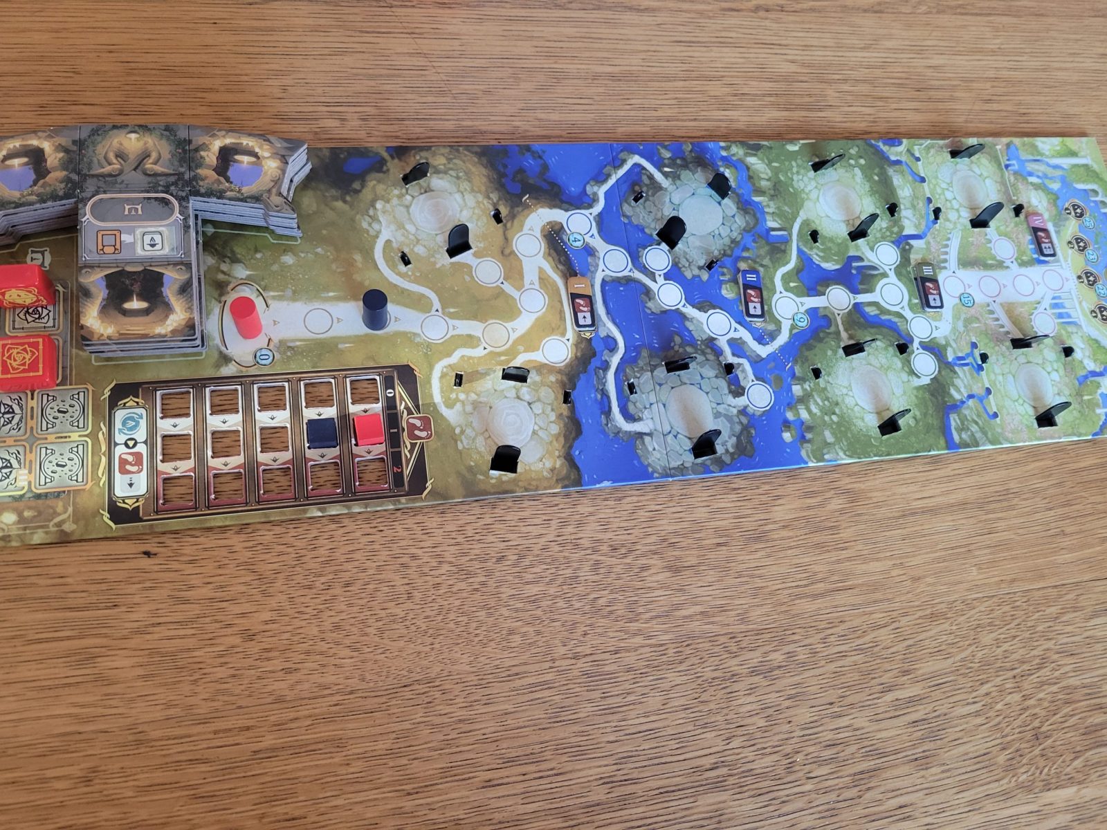 Our first module, folklore, has players priming artifacts and dropping them at the end of movements to play one of their folklore cards, which get souped up when dropped on another player’s. In the base game, you generally didn’t care too much about where the other players were going other than perhaps trying to optimally drop a bridge or avoid getting blocked out of a pillar if you’re going that route that game, but Folklore makes the god movement part of the game much more interactive and interesting. Love it.