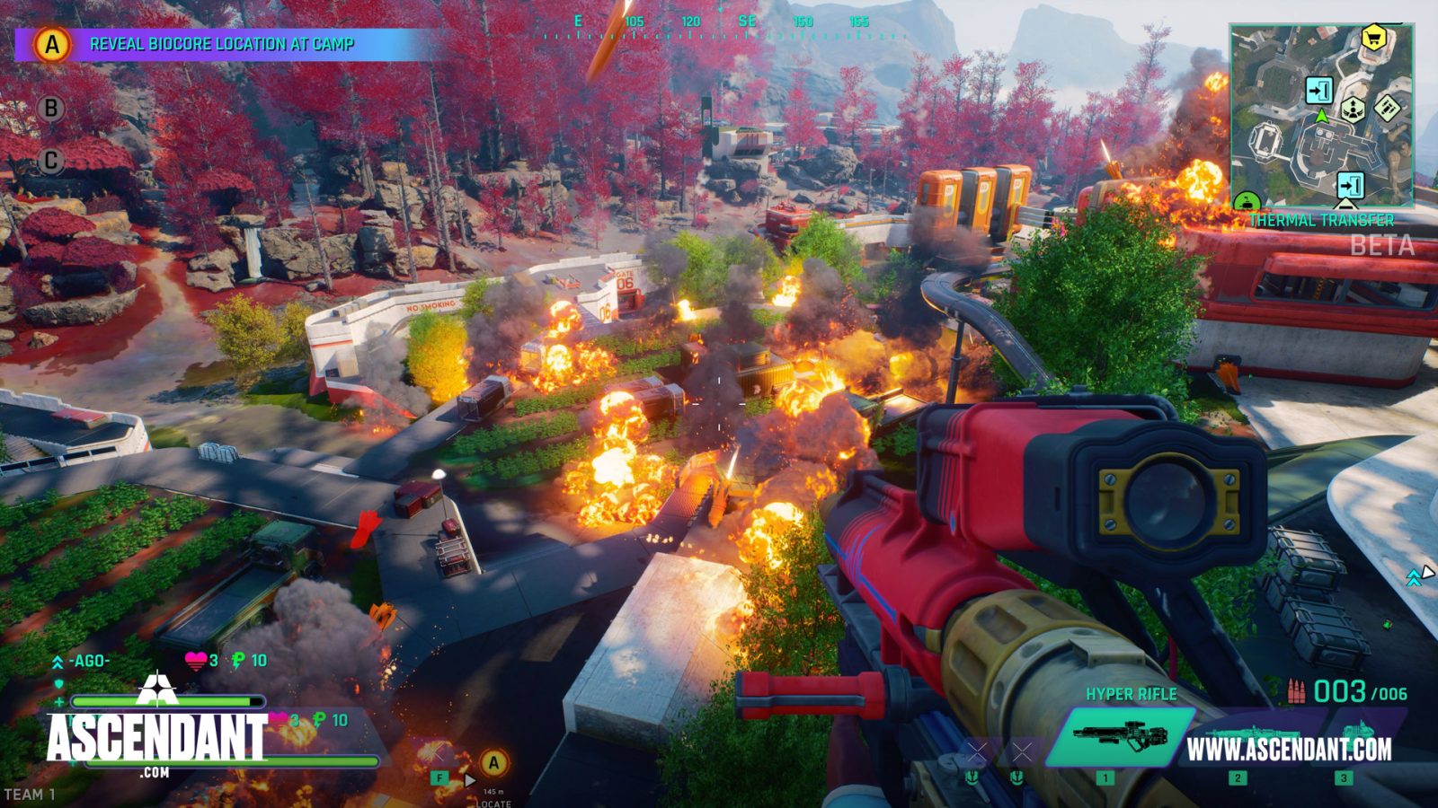 The main mode for ASCENDANT.COM has you playing a pseudo Capture the Flag match between four teams of three players. There are three Biocores to grab, and whoever has the most of them at the end wins. There’s a lot going on between loading in and leaving with your Biocores, and the steps along the way make this an interesting game.
