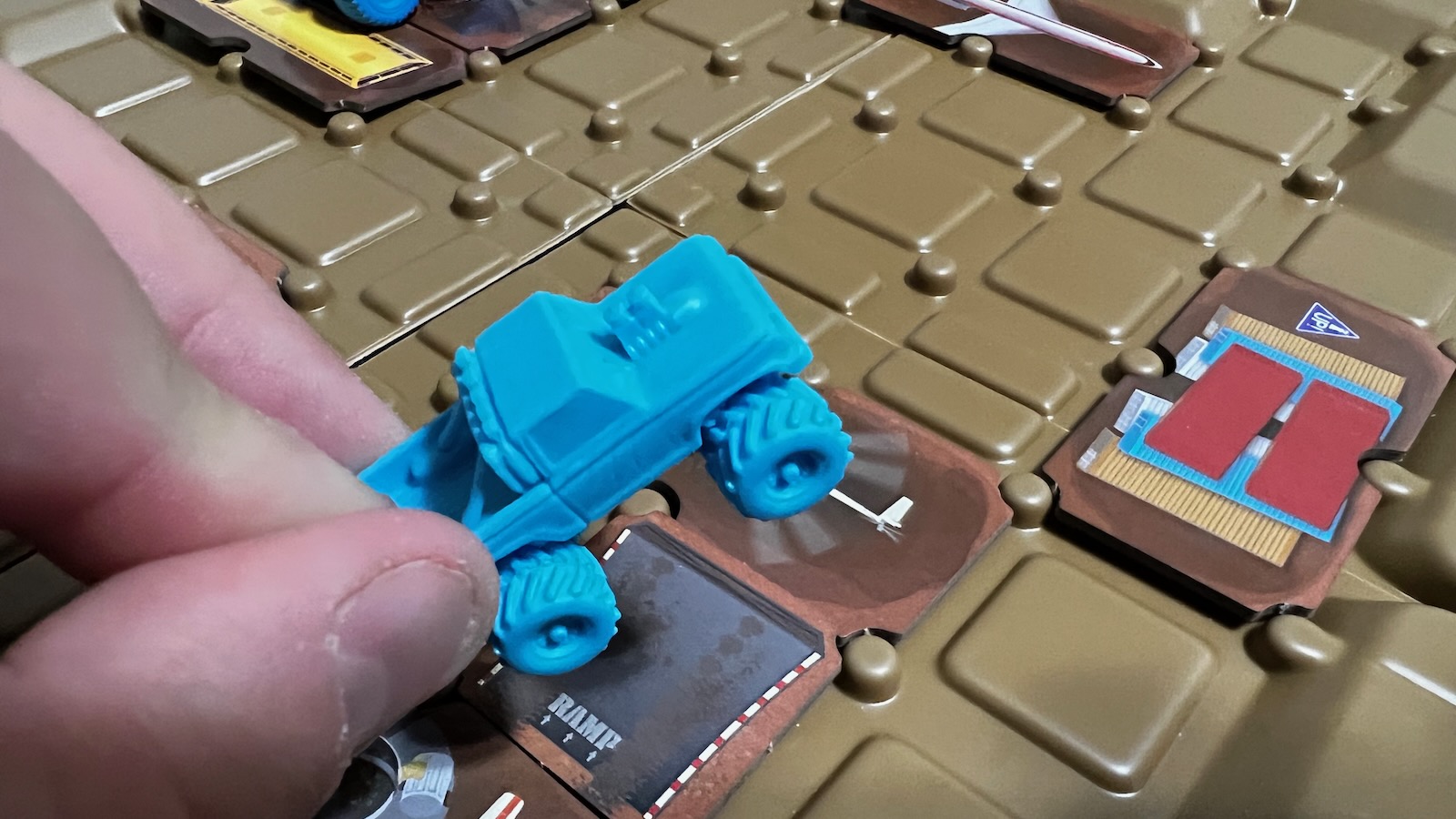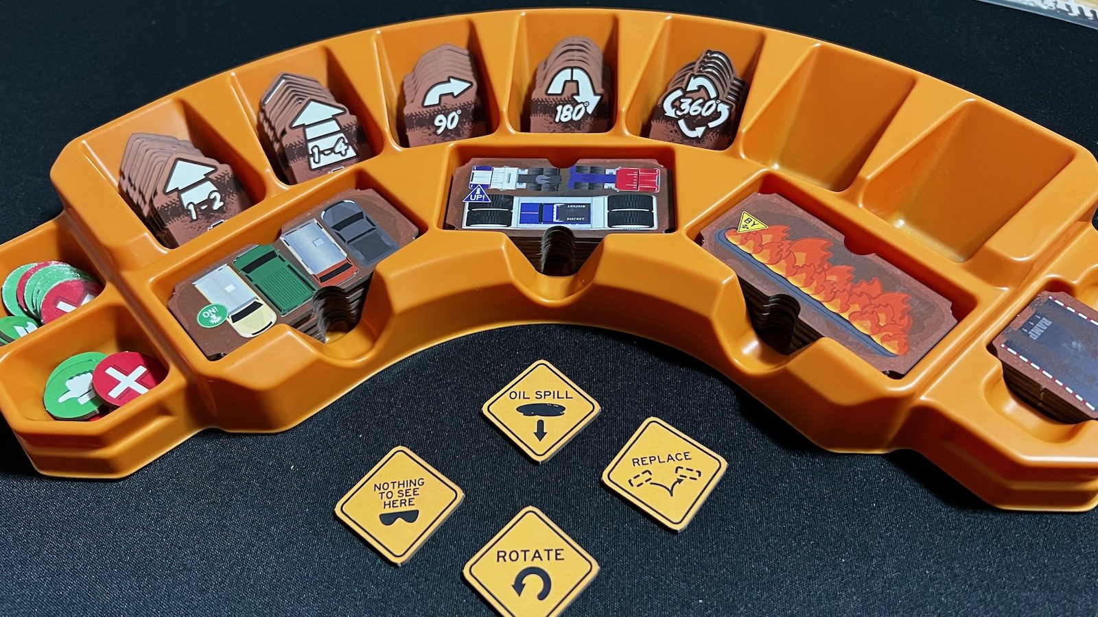 In Phase 2, players will plan their run using a variety of tiles available for purchase. Tiles range from 0-5 points and allow players to move forward a number of spaces and make 90, 180, and 360 degree turns. Players can also buy ramps to help the trucks get airborne. In their planning, players are trying to interact with as many elements as possible to maximize their scores. Obstacles can earn a player anywhere from 2-5 points. Style cards can also be used during the run to enhance the scores, repeat moves, turn certain obstacles into ramps, and a variety of other things.