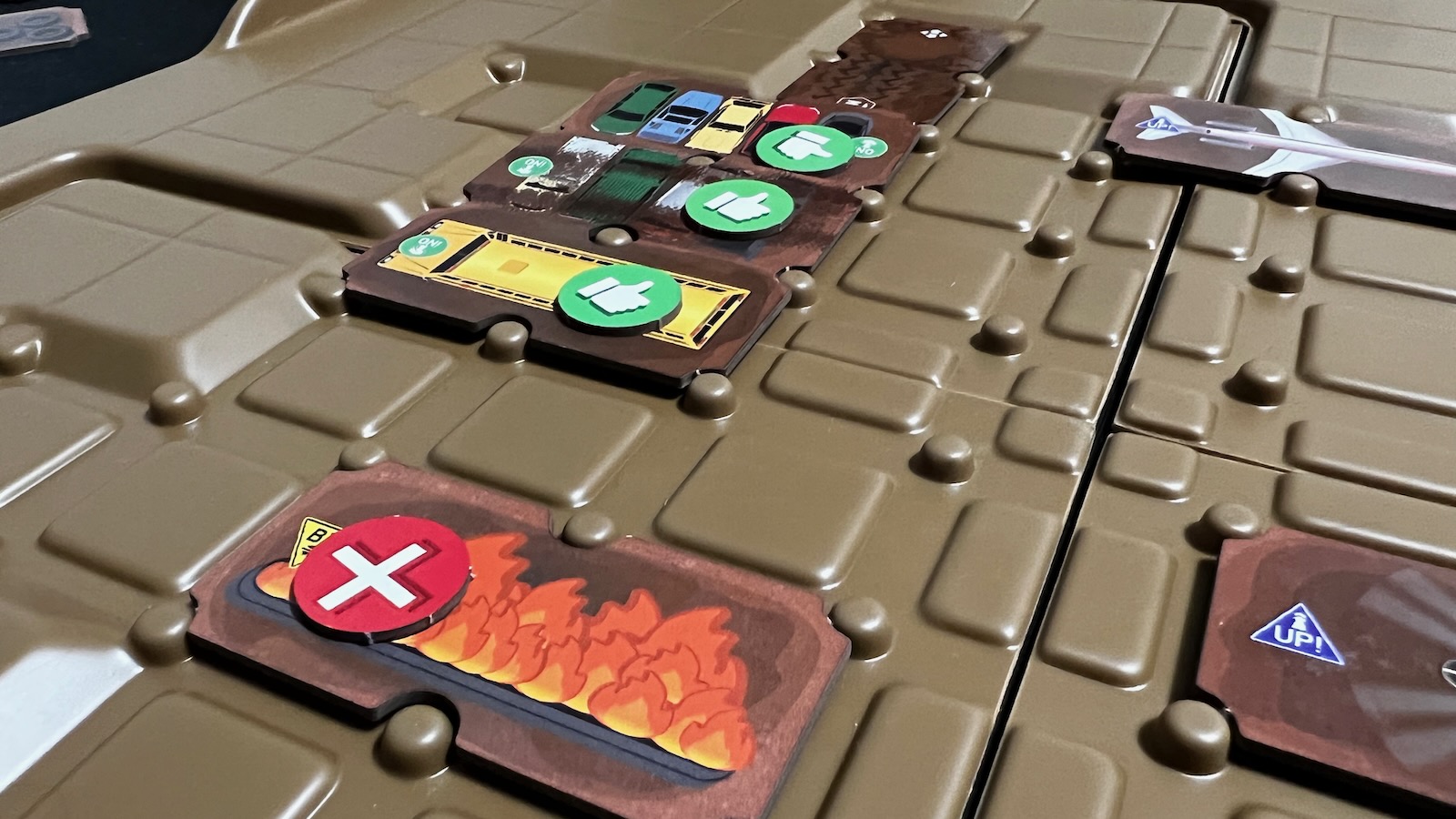 A scored run. Thumbs up tokens on successful obstacles and red x tokens for failed obstacles.