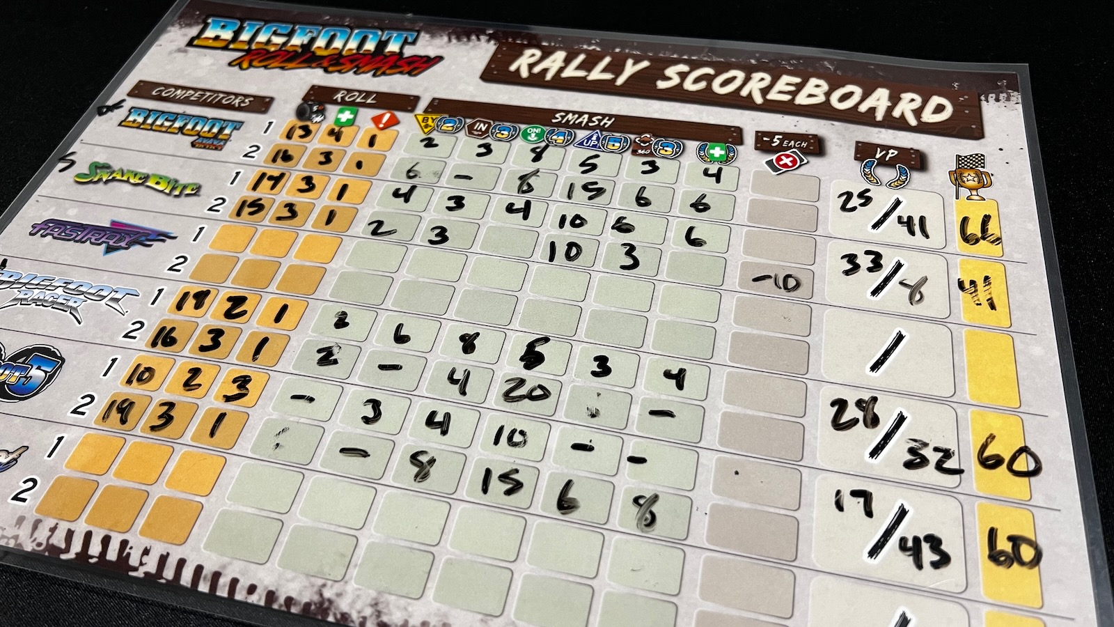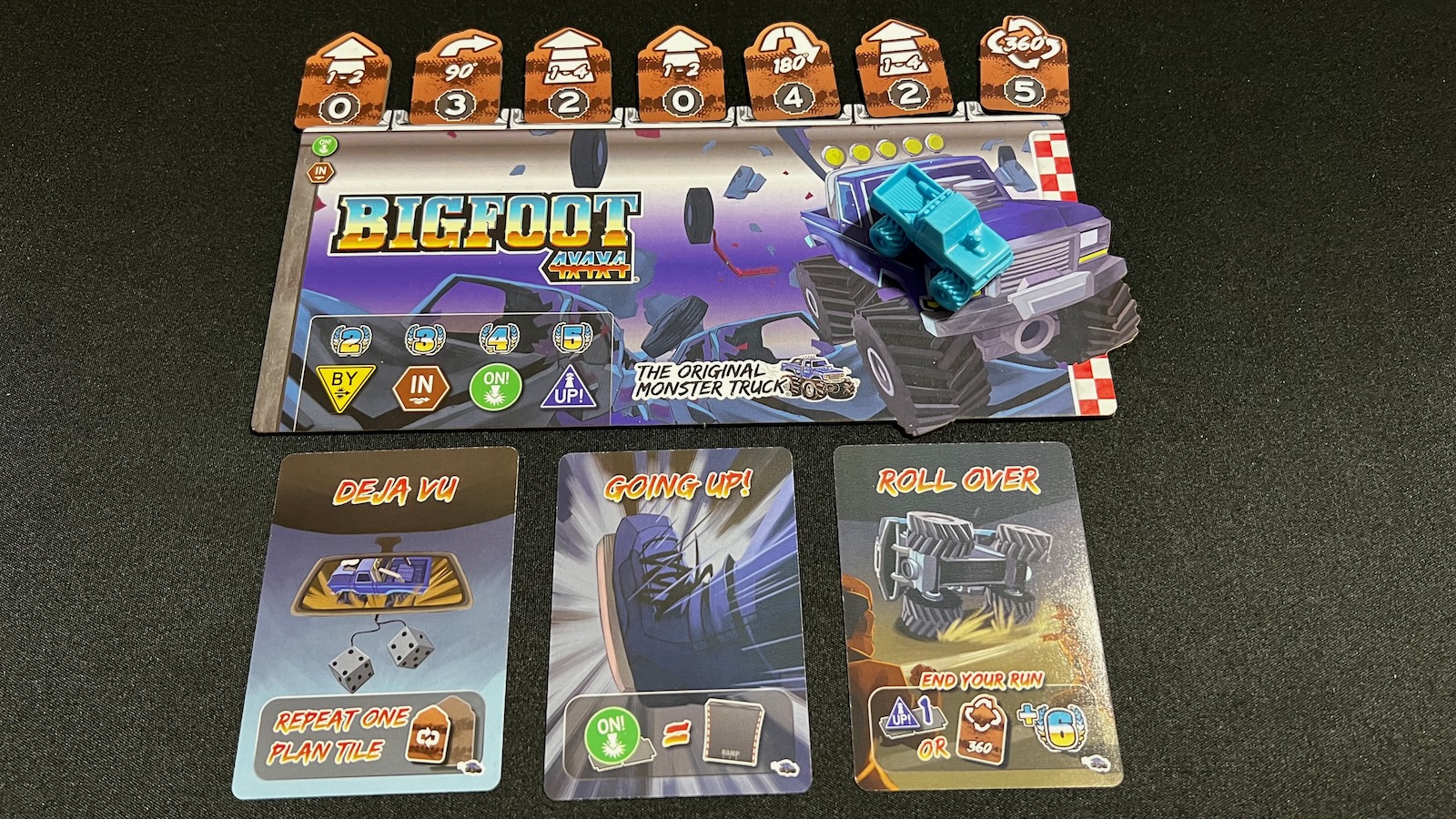 A Mods Expansion is also available for preorder that adds two new trucks, the ability to play up to 6 players, and the crew module. The 5-6 player mode cuts planning tiles from seven to five tiles to keep the game moving. The crew module features professional drivers, monster truck legends, and expert crew to give you a leg up in your run. Also driving into the arena are Bigfoot 5 and Ms. Bigfoot along with some new obstacle tiles.