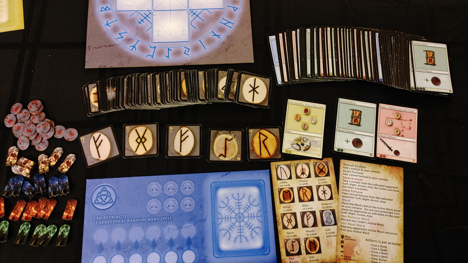 Since the number of acolytes you have determines the number of actions you can take, the spells granting more acolytes are the first step towards power. These can either be from making a new acolyte from your own pool, or stealing an acolyte from another player, reducing how many they will be able to make during the game. Players can also cast ward spells to prevent aggressive spells from another player, as well as hexes, which dismantle any active ward. The final goal of the game is to acquire 6 blood fortunes by any means necessary, so once you have your defenses up and have raised your army of acolytes, you should do your best to create, or steal, those favors next.