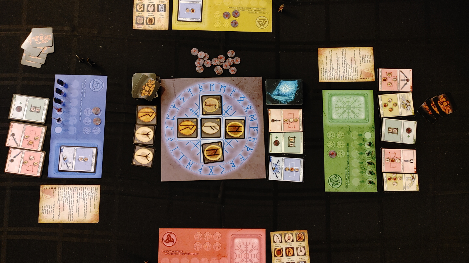 There’s a lot to like in this system. For one, each rune you place can be used by an opponent to potentially attack you, so taking an action to cover up a rare rune that an opponent needs is very often the best use of an acolyte. The action economy ramps up to a satisfying crescendo when everything goes well, with players sometimes dropping an entire spell in one go and casting it before anyone can respond.