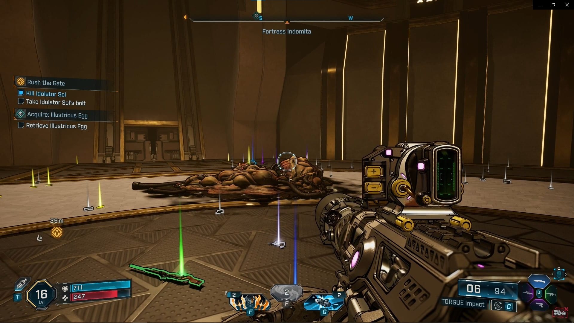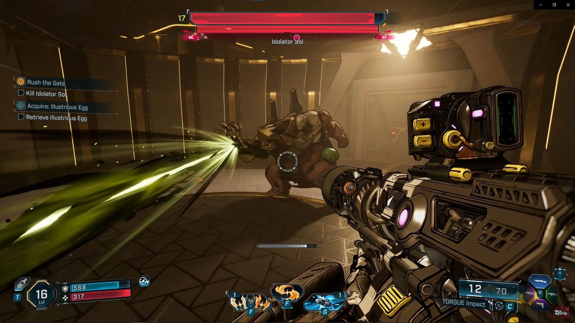 Room after room, I fought on. I employed a great deal of tools at my disposal: a couple of shotgun blasts here, a radioactive grenade there, an ice axe over that way, the occasional elemental glaive tossed in for good measure. Sol’s cronies nearly got me a few times, but they were no match for my incredible brawn…and bullets.