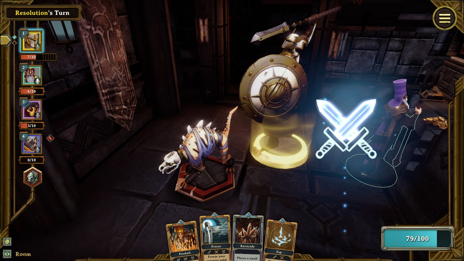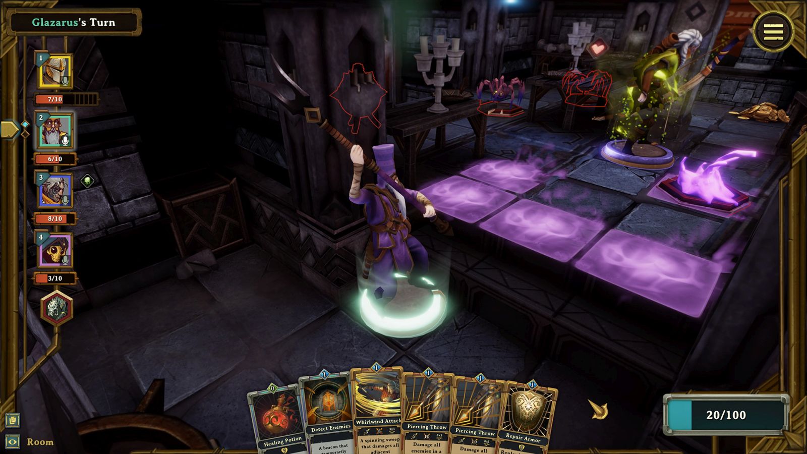 The Guardian is your tank, providing front line support for your crew. He can replenish five armor points each turn, and has a special attack that will knock enemies back a square. What looks to be the most versatile class in the game is the Assassin. He deals a tremendous amount of damage, can vanish using a sneak ability, and can passively backstab for an extra 3 damage per attack. When a lot of enemies have 4 or 6 health, that’s a ton. That said, he doesn’t absorb damage well. The Sorcerer is a support class, as you might expect, throwing out spells like fireball and freeze, but can also zap an enemy, stunning them. In practice, we found that to be extraordinarily helpful, as long as the enemy we were facing weren’t immune to it. The last playable class was the Archer – my character for this run. She’s able to unleash arrows from a distance, with single-use attacks like a poison arrow, and some area of effect attacks. To understand combat, however, you need to look at the cards.