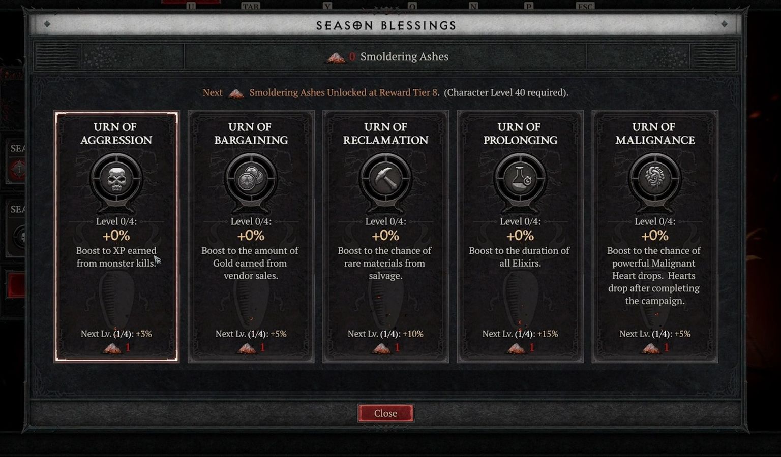 If you are wondering about the “Tiers” that were mentioned pre-launch, we finally have a good idea of what those look like. Season 1 will have a whopping 90 tiers – 27 free, and 63 Premium. Both will yield “Smoldering Ashes”, which can be spent on Season Blessings. These Blessings allow you to earn additional XP, Obols, Gold, and more, though these too will only last until the end of the Season of the Malignant.