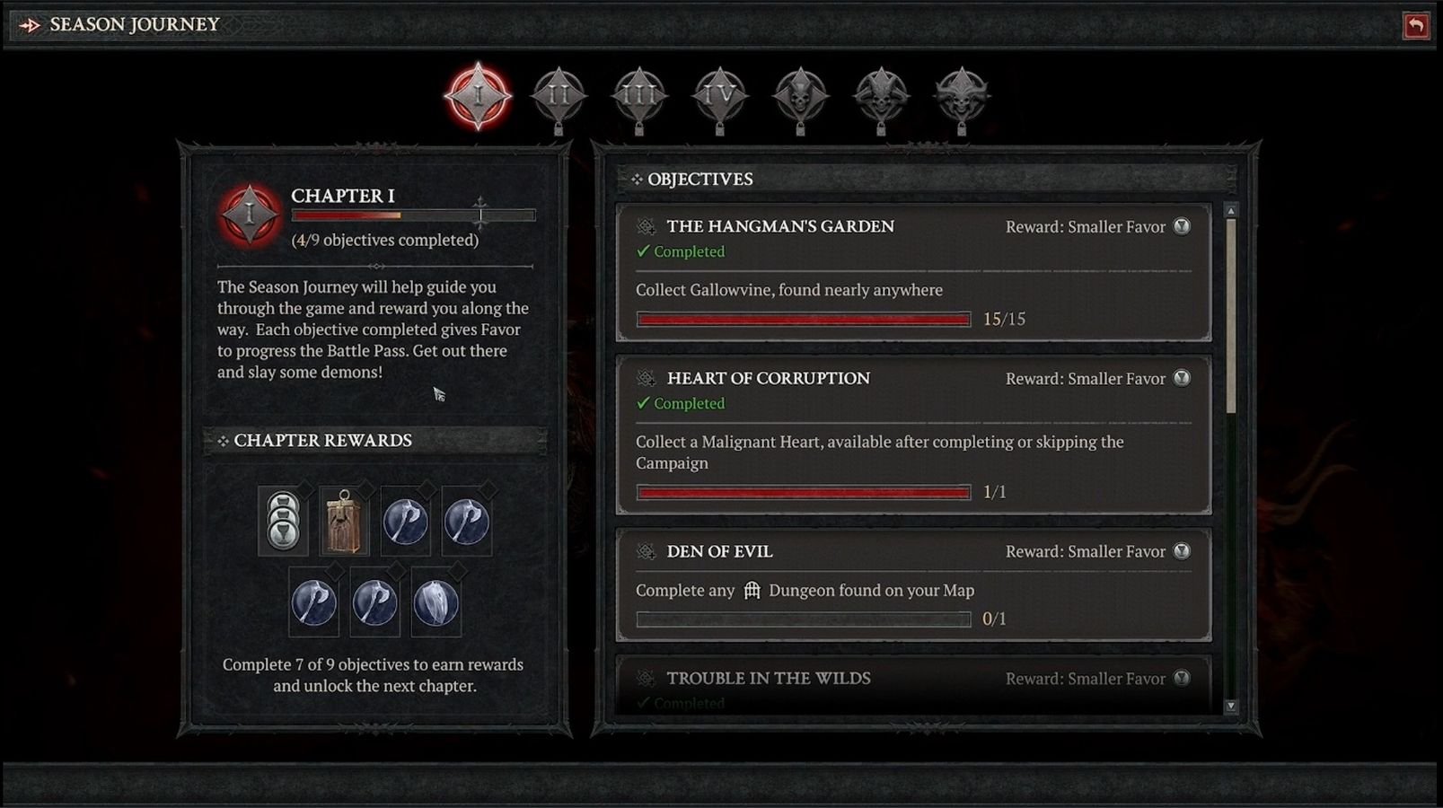 Another mechanic introduced is the concept of Favor, which lets you progress through the Battle Pass Tiers. There are a total of seven story chapters in Season of the Malignant (playing out similar to the various regions in the campaign), and completing the objectives will yield Favor. Trading in Favor, again, yields Season-wide rewards, though you won’t have to complete them all to progress to the next chapter.