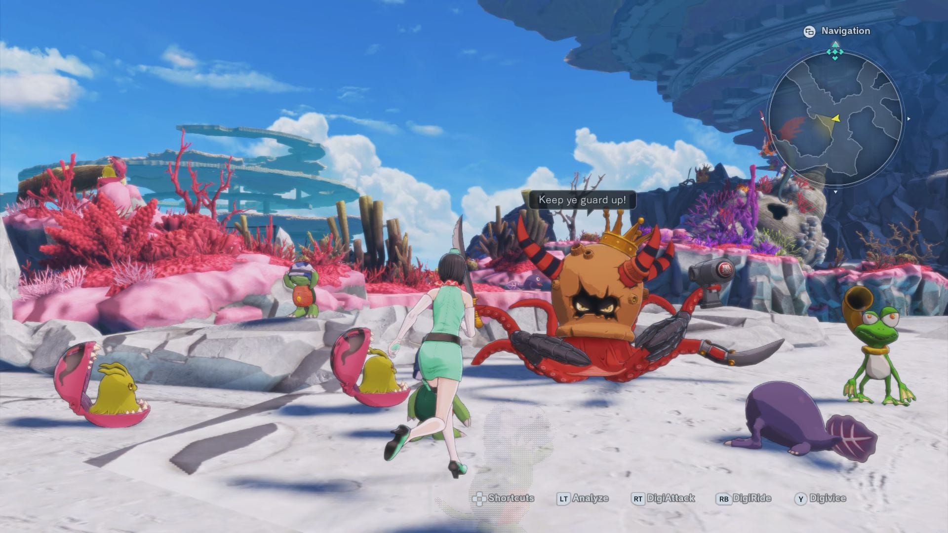 A fundamental world-building facet in Digimon is how the human world and the Digital World, where the creatures reside, are separate. In both demos, we witness judgmental reactions to each other. When the protagonist enters the Digital World in session one, a group of Digimon responds in fear an claims they are a villain. In the second session, one of the human characters praises Shellmon in comparison to the others by pegging him as a “...good Digimon” in comparison to others for practicing basic kindness. Also in this section, surface-dwelling Digimon are wary of the mons in the sea called Titians, as they both feud over ownership of land. Good ol’ passive and active racism. On the flipside, conflict with humans is shown by demonstrating the friction between a concerned father and his distrust of law enforcement, which serves as the capper to the first demo.