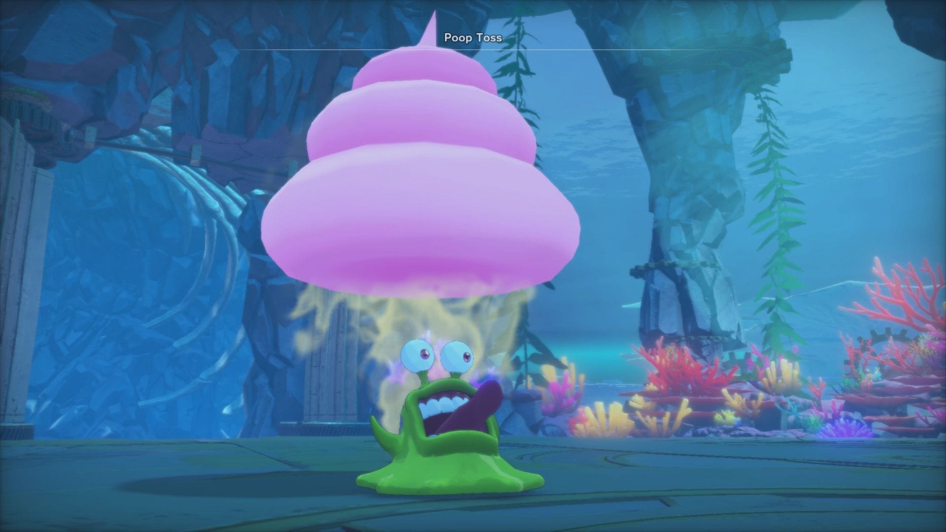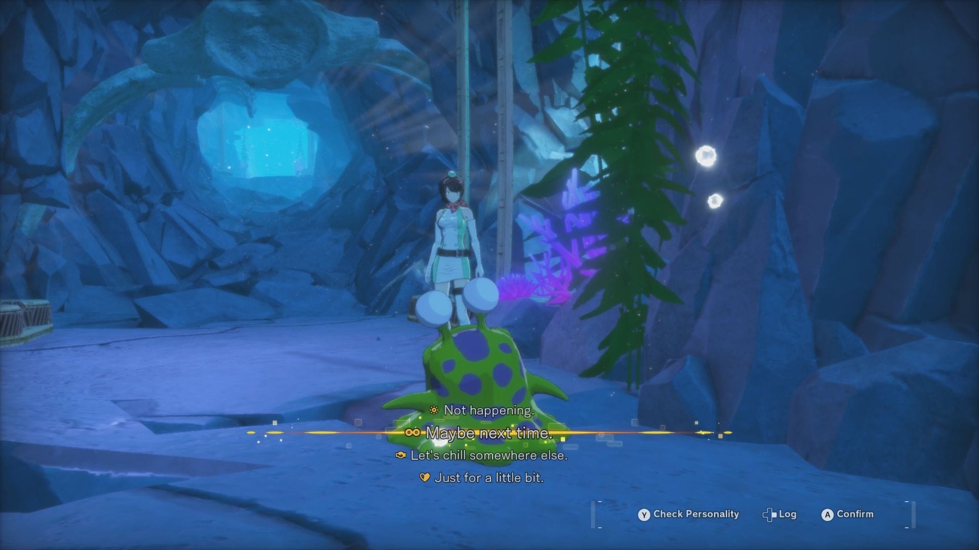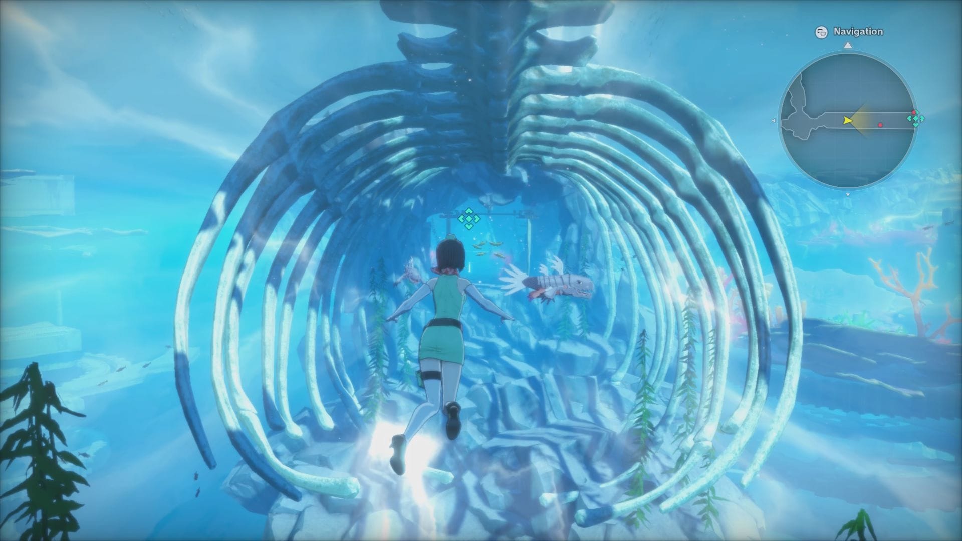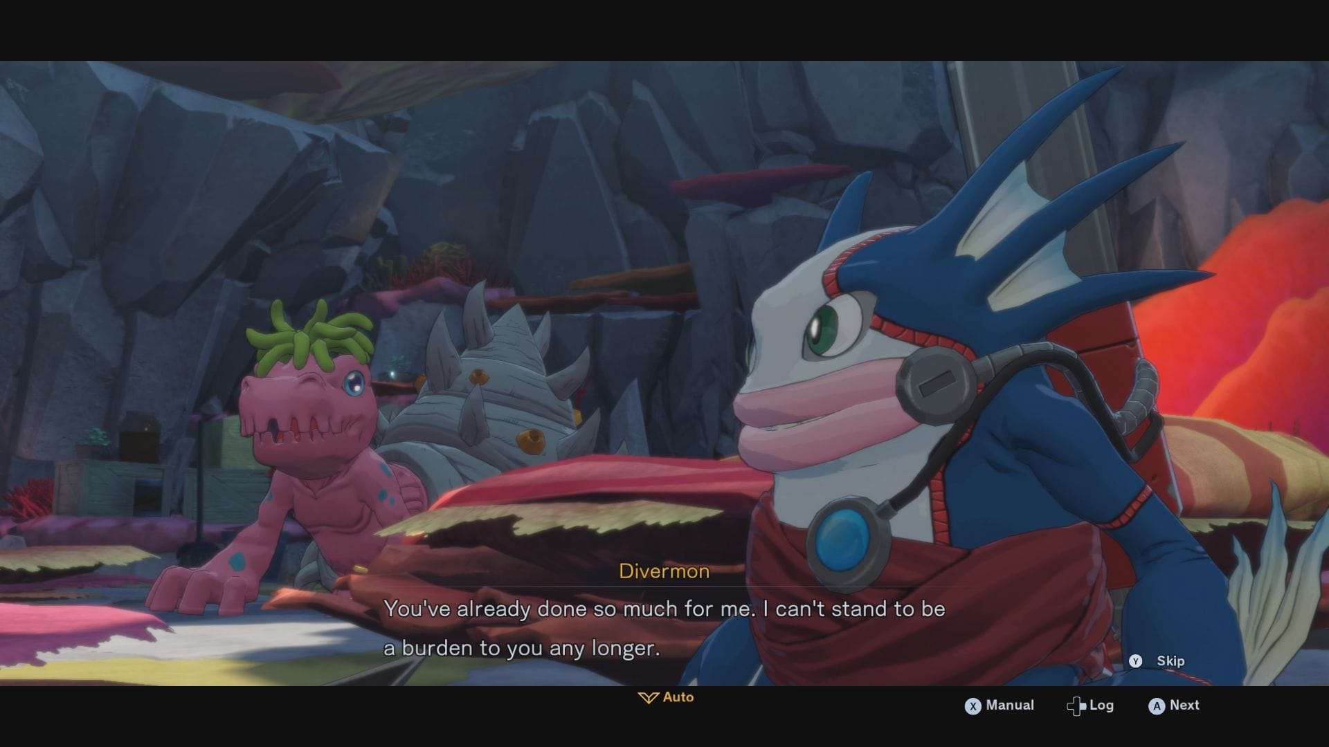 Occasionally, environmental obstacles stand in our path. These small bits are what give the dungeons a unique flair beyond their aesthetic flavoring. In the tutorial session, pressing the right trigger would command our Digimon to destroy the rubble doors and pathways. In the Abyss demo, currents would launch us across underwater cliffs, still giving player control to dodge enemies swimming in the current. Additionally, there was an attempt at contextualizing certain sequences with story set pieces, such as running from a giant monster or escorting a Digimon who's too scared to escape alone. These skew more towards illusions of varied gameplay, but they're welcome additions to keep things from getting overly stale.
