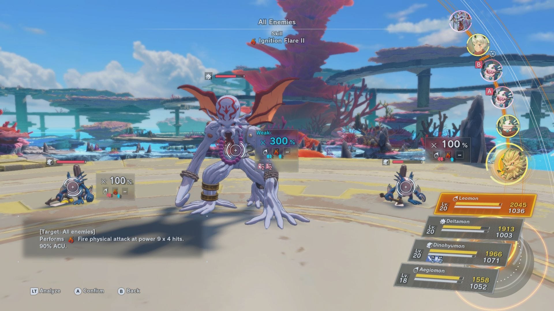 What gives Time Stranger its unique flair is how each attack synergizes this Attribute system with elemental weaknesses when determining damage calculation. Every skill will take on the Attribute of the user. As a result, a foe can be weak to or resist the same attack from two different Digimon depending on their Attribute. Let’s take a Data Digimon that has a weakness to water, but resists fire. A Virus Digimon will inherently have an advantage with most of its moves thanks to Virus beating data in the weakness triangle. That advantage will skyrocket if you command it to use a water skill, combining the two enemy weaknesses to multiply your own damage. Conversely, if the attack chosen is fire, the advantage of Virus will cancel out the resistance of fire, dealing normal damage. The same is true if a disadvantageous Vaccine Digimon uses a water skill.