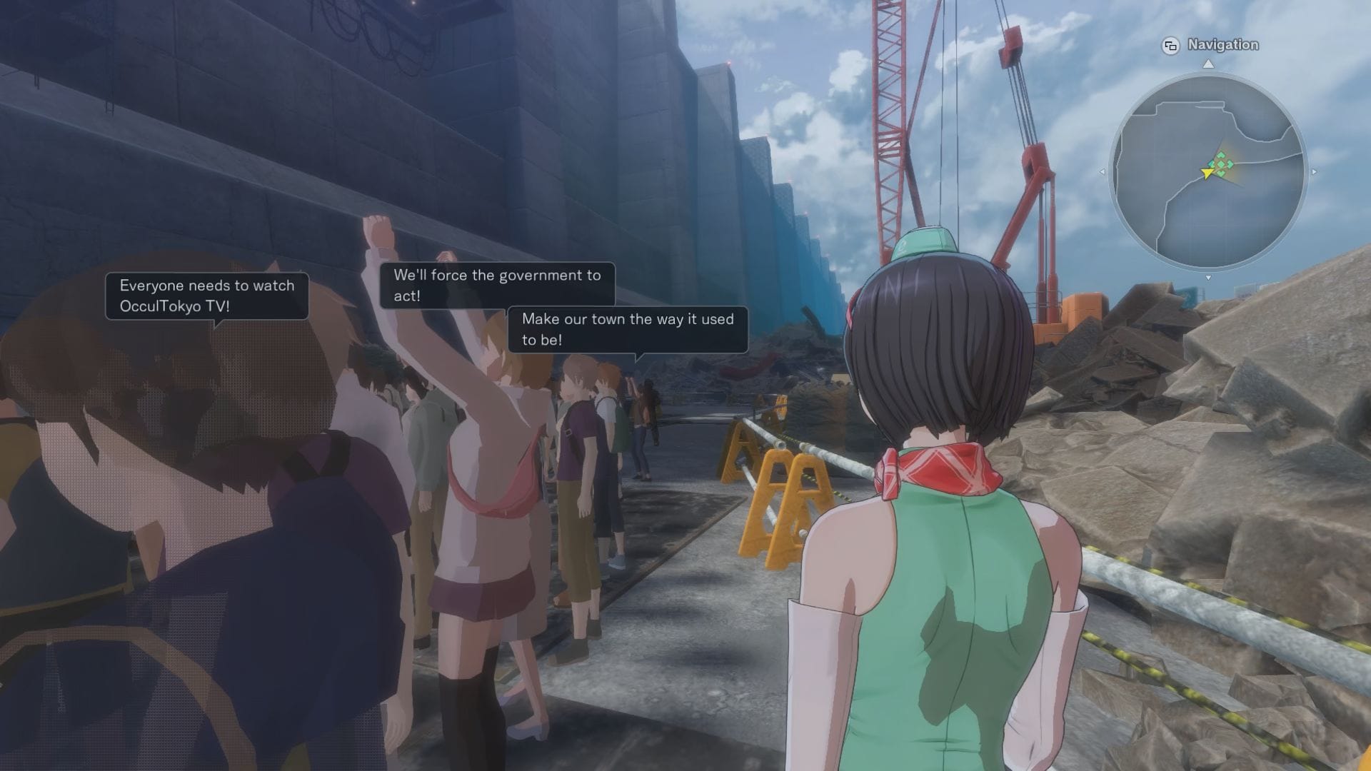 Circling back to the start of session one, heading towards the specified coordinates of our first objective further hammers home Time Stranger's commitment to depicting social issues. The main character’s walking speed slows as the camera zooms in to trail their back. A protest has broken out with the civilians criticizing the government for hiding something behind a towering barrier called the “Wall of Hope”.