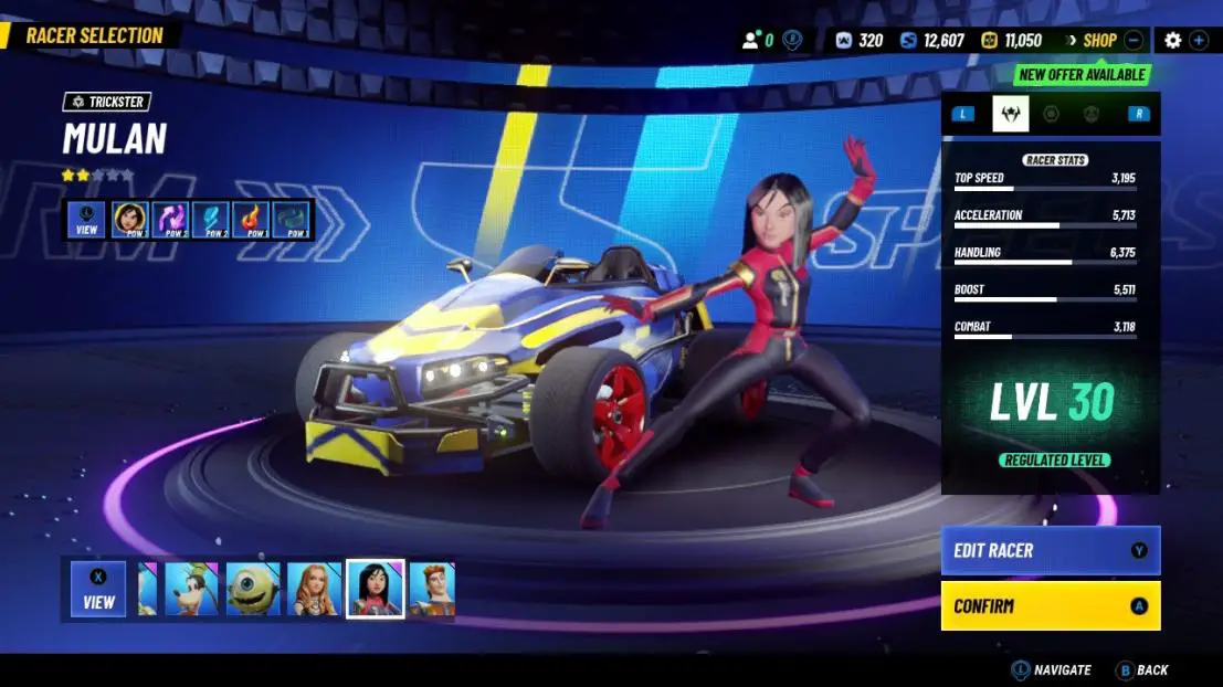 The roster is full of characters from different movies each falling into a specific category; Speedster (Micky, Belle, Mowgli, Belle), Brawler (Donald, Hercules, Beast), Defender (Goofy, Elizabeth Swann, Shang, Baloo), and Trickster (Jack Sparrow, Meg, Mulan). Each one has different statistics allowing you to find your favorite and level those characters up. Each character also has different items they can use during matches. This also makes you have to choose sometimes based on the items you want, rather than the character. I found myself enjoying speedster and I regret using my “bonus character unlock” on neither Belle nor Mowgli. Alongside the main drivers are the pit crew which adds bonuses, these are generally side characters like Pluto, Mushu, Mrs. Potts, etc. They are all available in a few different venues and are upgradeable as well.