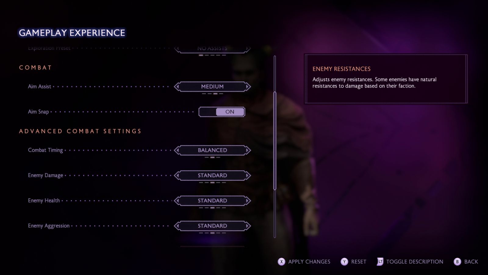 Flipping over to Accessibility, it came as no surprise that Bioware has worked hard at inclusion here — a theme that would run throughout this preview and this game overall. You can adjust camera shake, choose from four color vision deficiency choices (Protanopia, deuteranopia, tritanopia, and off), drop a persistent dot on the center of the screen (which can be used for sight-impaired folks to have a “true north” from which to navigate), and adjustable hold inputs (tap vs. hold). Other examples include two sizes for subtitles, accessibility sound effects (audio cues for things like incoming attacks, targeting lock-on and conversation wheels), an “Enable Glint Ping” (an optional ping sound like you heard when scanning in Dragon Age: Inquisition, with a sound loudness adjustment), and whether you’d like a red indicator on your screen edges when you are low on health. These are joined by subtitle visibility options, and six additional advanced subtitle choices such as color, directionality, NPC names, subtitle background opacity, and there’s a fade in or out on the animation if you find the subtitles popping onto and off of the screen distracting. Diving into controller vibration, there are seven different sliders and toggles on intensity for things like combat, cinematics, assists, and more. Finally, in the “Other” tab, is one more toggle you should probably consider — whether or not you’d like nudity in the game or not, as it’s on by default.